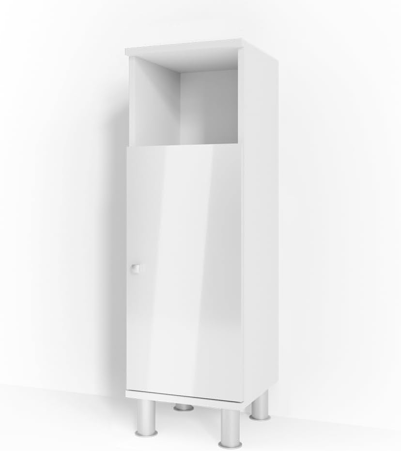 Der Vicco 'Fynn' Midischrank ist die ideale Lösung für Ihr Badezimmer, wenn Sie minimalistisches Design und viel Stauraum suchen. Mit eleganten Metallfüßen und der Möglichkeit, die Türöffnung zu ändern, passt er sich flexibel an Ihre Bedürfnisse an. Der Schrank ist aus pflegeleichter Spanplatte gefertigt und mit einer Melaminharzbeschichtung versehen, was ihn sowohl funktional als auch ästhetisch ansprechend macht. **Highlights** - Minimalistisches Design für ein modernes Badezimmer - Türöffnung kann umgekehrt werden - Elegante Metallfüße für Stabilität - Kompatibel mit anderen Produkten der Fynn-Kollektion - Pflegeleichte Oberfläche durch Melaminharzbeschichtung **Produkteigenschaften** - Farbe: Weiß Hochglanz - Maße (BxHxT): 30 x 95 x 30 cm - Material: Spanplatte, 16 mm - Artikelgewicht: 12,1 kg - Artikelgewicht inkl. Verpackung: 13,6 kg **Lieferumfang** - Midischrank - Montageanleitung - Montagematerial