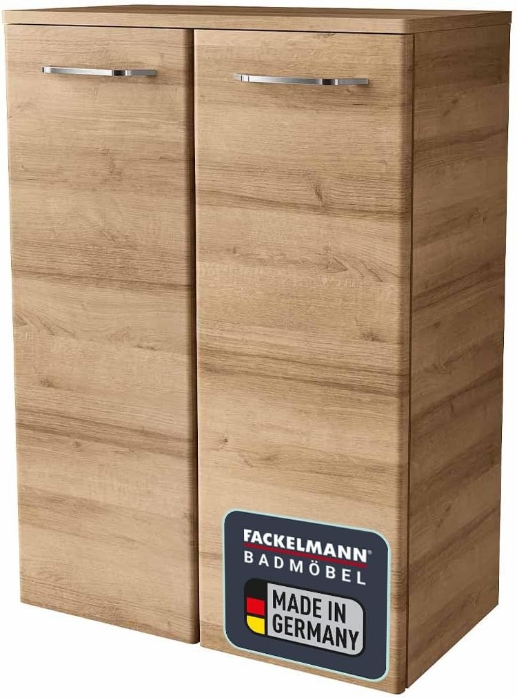 Der Fackelmann MILANO Doppel Midischrank 60 cm in Braun hell bietet optimalen Stauraum für Badaccessoires. Mit seinem natürlichen Design in Eiche-Optik schafft er eine warme Atmosphäre im Badezimmer. Die beiden Türen schließen sanft dank der gedämpften Scharniere. Der Schrank ist ideal für die Fackelmann-Wäschebox (Art. Nr. 84619) und weitere Badutensilien geeignet. **Highlights** - Natürliches Design in Braun hell/Asteiche - Gedämpfte Scharniere für sanftes Schließen - Viel Stauraum für Badaccessoires - Made in Germany - hohe Qualität - Querteile und Rückwand in silbergrau **Produkteigenschaften** - Maße: 60,5 cm Breite, 83 cm Höhe, 32 cm Tiefe - Ausstattung: 2 Türen, 2 Glaseinlegeböden - Montageart: zerlegt, hängend **Lieferumfang** - Zerlegter Schrank - Leicht verständliche Aufbauanleitung - Fackelmann-Wäschebox (Art. Nr. 84619) nicht im Lieferumfang enthalten