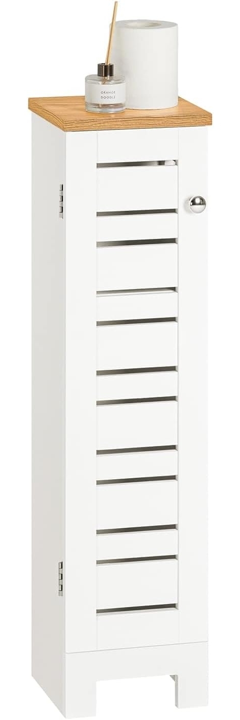 Der SoBuy Toilettenpapierhalter BZR85 ist ein freistehender Badschrank, der mit seinen kompakten Maßen von 20 x 79 x 18 cm optimal für schmale Nischen geeignet ist. Hergestellt aus hochwertigem MDF (E1) in Weiß-Natur, bietet er Platz für Toilettenpapier, Reinigungsmittel und Handtücher. Mit einem Gewicht von 4,8 kg und einer Belastbarkeit von bis zu 10 kg ist er stabil und funktional. Die lamellenförmigen Türen sorgen für eine gute Luftzirkulation und verhindern Schimmelbildung. **Highlights** - Maximale Raumnutzung: Ideal für kleine Badezimmer und schmale Räume. - Stilvolles Design: Minimalistisch in Weiß-Natur, passend zu jedem Badezimmermöbel-Set. - Anti-Schimmel-Funktion: Lamellenförmige Türen ermöglichen Luftzirkulation und halten den Inhalt trocken. - Einfache Montage: Schneller Aufbau dank klarer Anleitung. - Stabilität: Hergestellt aus robustem MDF (E1) mit einer Tragfähigkeit bis 10 kg. **Produkteigenschaften** - Farbe: Weiß-Natur - Material: MDF (E1) - Produktmaße (BHT): ca. 20 x 79 x 18 cm - Paketmaße (BHT): ca. 85 x 11 x 25 cm - Gewicht: 4,8 kg - Belastbarkeit: bis 10 kg **Lieferumfang** - 1 x Badregal - 1 x Zubehörbeutel - 1 x Anleitung