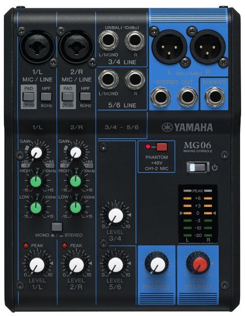 - Das Yamaha MG 06 Mischpult verfügt über 6 Kanäle, von denen 2 für Mikrofone geeignet sind.