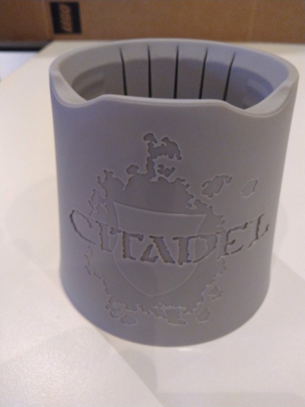 | Beschreibung | Der Citadel Water Pot ist mehr als nur ein Wassergefäß und wurde von Malern für Maler entworfen. Der Boden und die inneren Seitenwände des Water Pots, der aus stabilem grauen Kunststoff gefertigt ist, haben geriffelte Sektionen, deren Textur so gewählt wurde, dass sie Pinsel auf die effektivste Weise reinigt. Vertiefungen an der Oberseite erlauben dir, deine Pinsel horizontal zu lagern, wenn du sie nicht verwendest, und die Seiten verfügen über sich verjüngende Rillen – sobald du deinem Pinsel im Wasser gereinigt hast, zieh die Pinselhaare durch diese Rillen, um wieder eine schöne, feine Spitze zu erhalten! Der Water Pot durchmisst am Boden 100 mm und ist 90 mm hoch. |