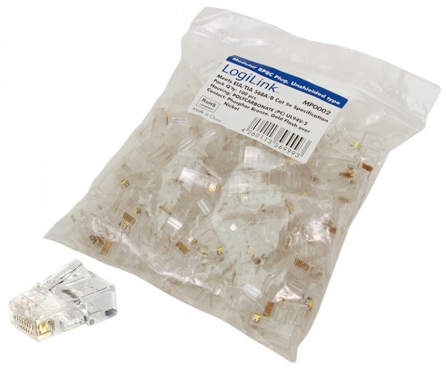in ModularsteckerLogiLink RJ45 Stecker für RundkabelKat.5e, geschirmt Modularstecker 8P8C für Rundkabel, vergoldete Kontakte, in Polybag beinhaltet: 100 Stück (MP0003)