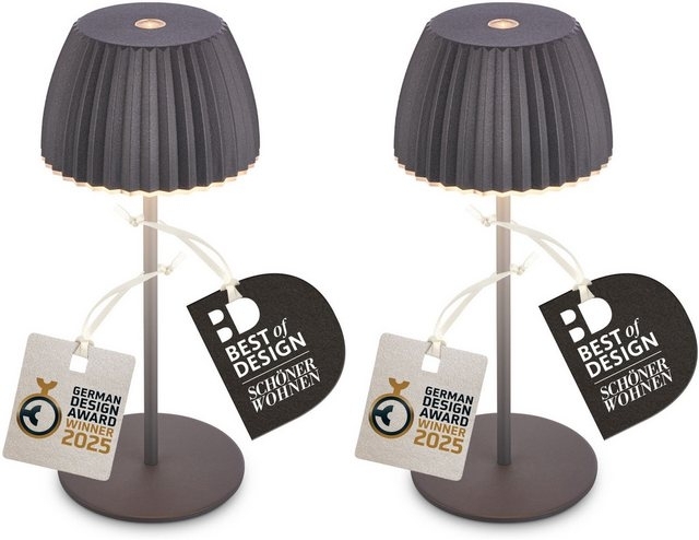 Präsentieren Sie stilvolles Licht mit der Briloner Leuchten LED Außen-Tischleuchte RIFFLE 7685025. Dieses preisgekrönte 2er-Set in Anthrazit überzeugt durch einen geriffelten Schirm und eine Lichtkante. Mit einem stufenlosen Touchdimmer und einer Memoryfunktion schaffen Sie individuelle Lichtstimmungen. Die wiederaufladbaren 1.800 mAh Akkus bieten bis zu 24 Stunden Leuchtdauer und sind dank IP44-Schutz sowohl für Innen- als auch Außenbereiche geeignet. **Highlights** - Preisgekröntes Design mit mehreren Auszeichnungen - Stufenloser Touchdimmer für individuelle Helligkeitseinstellungen - Wiederaufladbare 1.800 mAh Akkus für bis zu 24 Stunden Leuchtdauer - IP44-Schutz für spritzwassergeschützte Nutzung - Vielseitig einsetzbar als Nachtlicht oder dekorative Beleuchtung **Produkteigenschaften** - Farbe: Anthrazit - Maße: 0,5 m USB-C auf C Kabel - Verwendung: Innen- und Außenbereich - Lichtkante für stimmungsvolle Akzente **Lieferumfang** - 2x Akku Tischleuchten - 1x0,5 m USB-C auf C Kabel - Ausschluss von weiteren Zubehörteilen