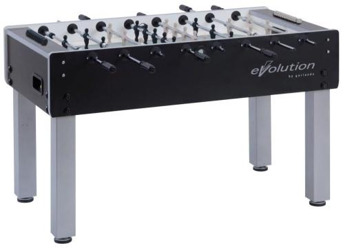 | Beschreibung | Der G-500 Evolution ist ein in Europa produzierter und erstklassiger Tischkicker, der durch die Auswahl der hochwertigen Materialien sowie technisch anspruchsvollen Komponenten exzellent zusammengestellt wurde. Der qualitativ hochwertiger Tischkicker mit 25mm starkem MDF-Korpus dessen Oberfläche über eine robuste Melaminbeschichtung verfügt ist mit einem unempfindlichen schwarz-silberernen EVOLUTION Dekor asugestattet und ist leicht zu reinigen. Der ideale, robuste Tischkicker für den Innenbereich, geeignet für Jugendräume / Schulen, Vereinsheime und offizielle Einrichtungen. Tischkorpus: Der Tischkorpus¬† esteht im Kern aus hochwertigem MDF-Material mit einer Seitenwandstärke von ca. 25mm. Die Korpus Oberfläche ist mit einer sehr robusten laminierten Melaminbeschichtung veredelt. Das unempfindliche schwarz-silberne Evolution Dekor ist leicht zu reinigen Spielstangen-Varianten Sport Professional PR Sport Safety SA Welche Stange passt zu mir? Informationen zu den unterschiedlichen Spielstangen-Varianten finden Sie auf unserer FAQ-Seite. Spielstangen - Stabile 16mm (Wandstärke 2,2mm) verchromte Spielstangen mit schwarzen Kunststoffgriffen die in Kugellagern laufen. Die nahezu unzerbrechlichen Spieler sind fest auf die Stangen gegossen, sowie zur Korpuswand hin mit Distanzfedern gedämpft. 360¬8 frei rotierender Torwart. Spielfäche: Laminat- Spielfeld Abmessungen 120 x 70 cm in grün mit weißen Linien und aufgesetzten Kunststoff-Ecken. Tischbeinkonstruktion: Die vier silber lackierten Metall-Tischbeine (ca. 9 x 9cm) sorgen für einen hohen Grad an Stabilität. Die integrierten Höhenversteller (Drehteller) ermöglichen den Ausgleich von Bodenunebenheiten ( und schützen gleichzeitig Bodenbeläge vor möglichen Schlieren oder Kratzern. Die Griffhöhe beträgt ca. 84cm. Torkasten - Durch die in die Stirnseiten integrierten Ball- / Torkästen kann eine einfache Ballentnahme von beiden Tischseiten erfolgen. Balleinwurfschalen komplettieren den Spielkomfort. Abmessungen und Gewichte Spielstangen Aufstellmaße (Lx Bx H)Griffhöhe Spielfläche Gewicht Sport Professional PR ca. 144 x 125 x 88 cm ca. 84cm ca. 120 x 70cm ca. 75kg Sport Safety SA ca. 144 x 110 x 88 cm ca. 84cm ca. 120 x 70cm ca. 75kg Technische Daten Spielfläche (L x B): ca. 120 x 70cm Höhenverstellung: ca. 93,5cm Griffhöhe: ca. 84cm Tischbeine: ca. 9 x 9cm Durchmesser Nylon-Kickerbälle: ca. 34mm Gewicht Nylon-Kickerbälle: ca. 22g Lieferumfang 10 weiße Nylon-Kickerbälle Bebilderte Aufbau- und Bedienungsanleitung Montage und Lieferung Grundsätzlich wird dieser Tischkicker per Speditionsversand auf einer Einwegpalette \"Frei Bordsteinkante\" ausgeliefert. Die Montagedauer beträgt ca. 45 bis 60min. Der Korpus ist bereits vormontiert und ermöglicht eine zügige sowie einfache Selbstmontage. Für das perfekte Spielerlebnis mit genügend Bewegungsfreiheit sollten Sie ca. einen Meter rund um den Tischkicker¬†einplanen. Keywords Montage Spielstangen |