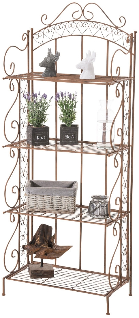 Das Standregal Antje im antik braunen Design vereint Robustheit und Stil. Hergestellt aus dickem Eisenrohr, bietet es eine hohe Stabilität und Langlebigkeit. Die pulverbeschichtete Oberfläche sorgt für eine ansprechende Optik, während die liebevollen Verzierungen im Landhausstil dem Regal einen charmanten Charakter verleihen. Bei Bedarf lässt sich das Regal einfach zusammenklappen und platzsparend verstauen. **Highlights** - Robustes und langlebiges Klappregal im Landhausstil - Hergestellt aus extrem stabilem und dickem Eisenrohr - Pulverbeschichtete Oberfläche für eine hochwertige Optik - Liebevolle Verzierungen im antiken Stil - Einfaches Zusammenklappen bei Bedarf **Produkteigenschaften** - Gesamthöhe: 153 cm - Gesamtbreite: 61 cm - Gesamttiefe: 33 cm - Max. Belastbarkeit: 32 kg - Max. Belastbarkeit je Regalboden: 8 kg - Regal 1: Höhe (vom Boden): 10 cm, Länge der Fläche: 58 cm, Tiefe der Fläche: 28 cm - Regal 2: Höhe (vom Boden): 46 cm - Regal 3: Höhe (vom Boden): 82 cm - Regal 4: Höhe (vom Boden): 117 cm