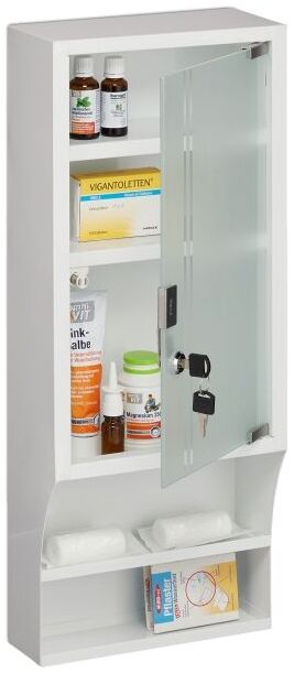 Sorgen Sie für Ordnung in Ihrer Hausapotheke mit dem abschließbaren Medizinschrank mit Glastür. Der weiße Arzneimittelschrank aus einem modernen Materialmix von Stahl und Glas bietet mit seinen 5 Fächern ausreichend Platz für Medikamente, Verbandsmaterialien und Erste-Hilfe-Sets. Dank des Schlosses bleibt der Inhalt sicher vor neugierigen Kindern. Die einfache Wandmontage ermöglicht eine platzsparende Aufhängung. **Highlights** - 5 geräumige Fächer bieten viel Platz zum Verstauen - Sichere Lagerung dank verschließbarer Tür - Bequemes Öffnen und Schließen durch Soft-Close-Funktion - Einfache Wandmontage für platzsparende Aufhängung - Perfekt für Zuhause, Büro oder öffentliche Einrichtungen **Produkteigenschaften** - Gesamtmaße H x B x T: ca. 65 x 27 x 12 cm - Gewicht: ca. 3,4 kg - Material: Stahl, Glas - Farbe: Weiß, Transparent, Silber - Innenmaße großes Fach H x B x T: ca. 25 x 26,5 x 10 cm - Innenmaße kleine Fächer H x B x T: ca. 11,5 x 26,5 x 10 cm - Traglast Innenfächer: je max. 5 kg - Maße unteres offenes Fach H x B x T: ca. 11 x 26,5 x 11,5 cm - Maße unterstes offenes Fach H x B x T: ca. 8,5 x 26,5 x 8 cm - Traglast offene Fächer: je max. 2 kg **Lieferumfang** - 1x Medizinschrank - 2x Schlüssel - Mit Montagematerial - Dekoartikel sind nicht im Lieferumfang enthalten