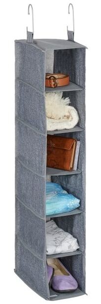 Mit dem Kleiderschrank Hängeregal 10048062 bringen Sie Ordnung in Ihren Kleiderschrank und schaffen zusätzlichen Stauraum an der Kleiderstange. Der Hängeorganizer verfügt über 6 Fächer, die sich ideal zum Verstauen von Kleidung und Accessoires eignen. Dank der verstärkten Böden ist das Stoffregal stabil und lässt sich einfach mit 2 Metallhaken aufhängen. Bei Nichtgebrauch kann der Organizer platzsparend zusammengefaltet werden. **Highlights** - 6 geräumige Fächer für Kleidung, Schuhe und Accessoires - Stabilität durch verstärkte Böden - Platzsparend zusammenfaltbar für Reisen - Einfache Aufhängung an der Kleiderstange - Reinigung mit einem feuchten Tuch empfohlen **Produkteigenschaften** - Gesamtmaße H x B x T: ca. 92 x 15,5 x 30 cm - Höhe ohne Haken: ca. 80 cm - Innenmaße je Fach H x B x T: ca. 13 x 13,5 x 29,5 cm - Max. Traglast je Fach: ca. 1,5 kg - Gewicht: ca. 430 g - Material: Polyester, Kunststoff, Pappe - Farbe: Grau, Schwarz **Lieferumfang** - 1x Kleiderschrank-Hängeorganizer - Dekoartikel sind nicht im Lieferumfang enthalten
