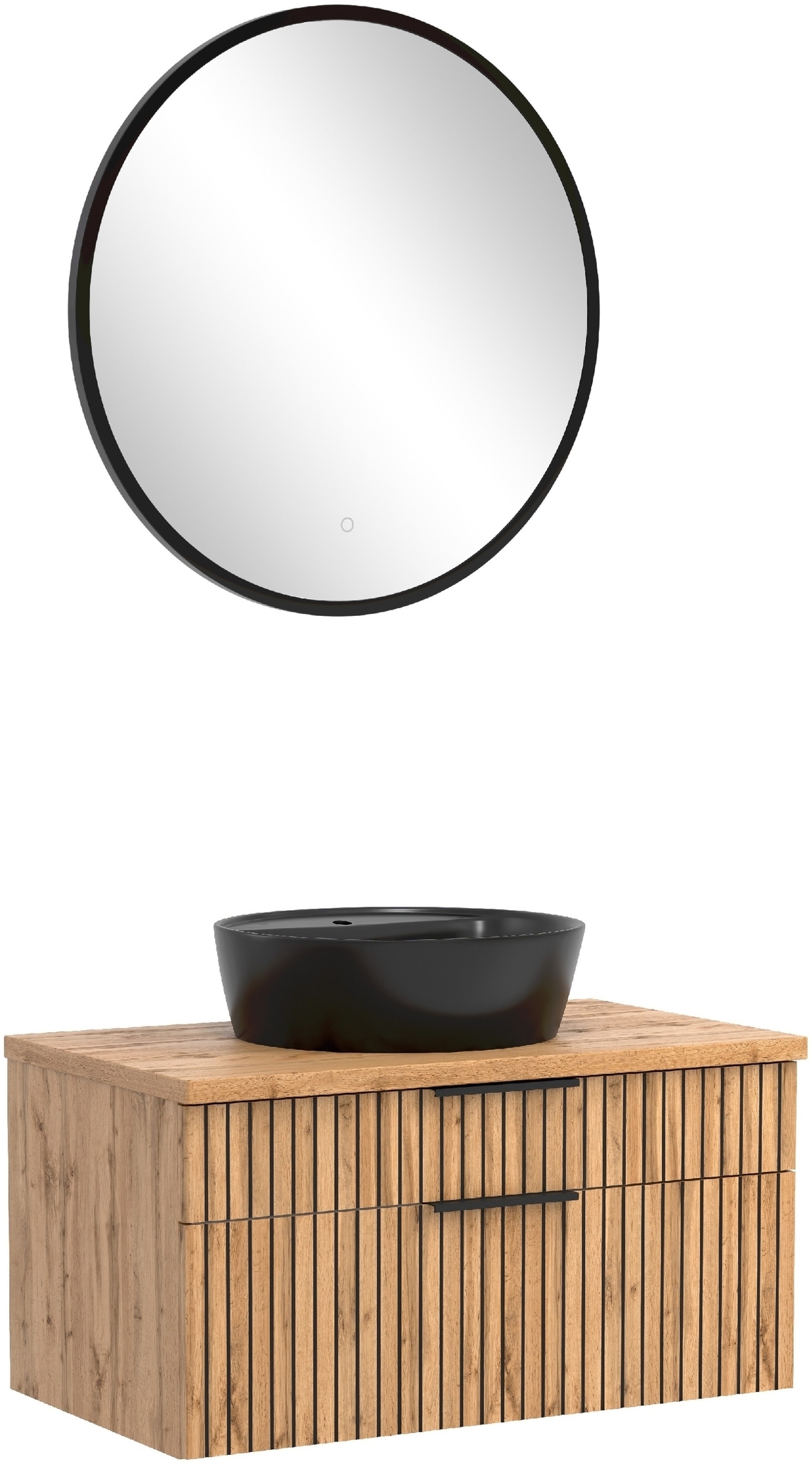 Das Waschtisch-Set Nizza (2-tlg.) in Wotaneiche und Schwarz überzeugt durch modernes Design und hochwertige Materialien. Mit den Abmessungen 80 x 200 x 47 cm (BxHxT) eignet es sich ideal für mittelgroße Badezimmer. Die Kombination aus Wotaneiche-Optik und eleganten schwarzen Akzenten schafft ein stilvolles Ambiente. Das Set umfasst einen Waschtisch mit einem schwarzen Aufsatz-Keramikbecken und ein Spiegelpaneel mit LED-Ambientebeleuchtung, das für optimale Sichtverhältnisse sorgt. **Highlights** - Modernes Design in Wotaneiche-Optik mit schwarzen Akzenten - Pflegeleichte und langlebige Oberflächen - Integrierte LED-Ambientebeleuchtung mit Touchschalter - Zwei geräumige Schubladen mit Softclose-Funktion - Stabile Metallscharniere und Griffleisten aus Metall **Produkteigenschaften** - Maße Waschtisch (B/H/T): 80 x 41 x 47 cm - Maße Spiegelpaneel: 60 cm Durchmesser - Material Fronten: MDF in Wotaneiche-Optik - Material Korpus: melaminbeschichtete Spanplatte - Lieferung zerlegt mit Aufbauanleitung **Lieferumfang** - Waschtisch mit schwarzem Aufsatz-Keramikbecken - Spiegelpaneel mit schwarzem Metallrahmen - Lieferung ohne Dekoration und Inhalt