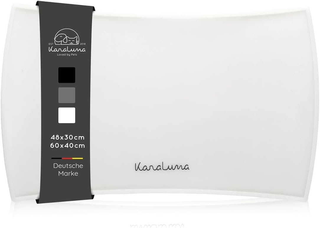 KaraLuna Futternapf Napfunterlage aus Silikon ist die ideale Lösung für jeden Hunde- und Katzenbesitzer. Mit einem hohen Rand verhindert die Unterlage Wasserflecken und angetrocknete Futterreste auf Ihrem Fußboden. Die rutschfeste Silikonoberfläche sorgt dafür, dass die Näpfe an ihrem Platz bleiben. Erhältlich in zwei Größen, passt die kleine Unterlage (48x30 cm) für 2-3 kleine Näpfe, während die große Unterlage (60x40 cm) für größere Näpfe oder Futterautomaten geeignet ist. **Highlights** - Hoher Mattenrand für sauberen und trockenen Fußboden - Rutschfestes Silikon mit Extra-Noppen für Stabilität - Einfache Reinigung per Hand oder in der Spülmaschine - Stylisches und modernes Design in verschiedenen Varianten **Produkteigenschaften** - Material: Silikon - Maße kleine Unterlage: 48x30 cm - Maße große Unterlage: 60x40 cm **Lieferumfang** - 1 x KaraLuna Silikonunterlage (ohne Dekoration wie Näpfe oder Futter)