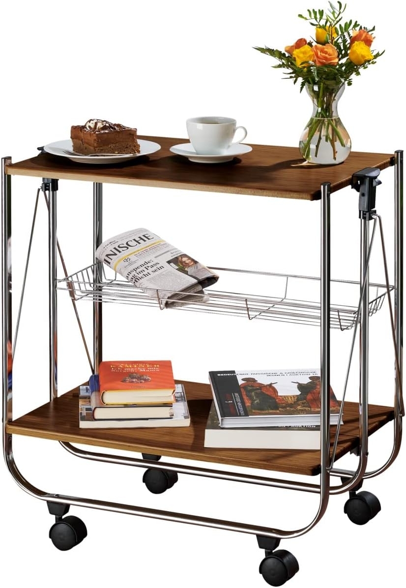 Der WENKO Dinett Servierwagen DELUXE ist ein vielseitiger Bartisch auf Rädern, ideal zum Servieren und Transportieren von Speisen und Geschirr. Mit zwei Ablageflächen und einem zusätzlichen Gitterkorb bietet er ausreichend Platz für Teller, Tassen und Getränke. Dank der vier leichtgängigen Rollen lässt sich der Wagen mühelos bewegen. Er ist zusammenklappbar und nimmt im gefalteten Zustand wenig Platz ein. Das robuste Gestell aus verchromtem Stahl sorgt für Stabilität und eine maximale Belastbarkeit von bis zu 40 kg. **Highlights** - Zwei Ablageflächen für optimale Ordnung - Zusammenklappbar für platzsparende Aufbewahrung - Robustes, verchromtes Stahlgestell für Stabilität - Vier leichtgängige Rollen für einfachen Transport - Maximale Belastbarkeit bis zu 40 kg **Produkteigenschaften** - Maße (L x B x H): 40,6 x 68 x 70 cm - Material: MDF-Holz, Metall verchromt - Gewicht: 9,511 kg - Zusätzlicher Gitterkorb für leichte Gegenstände - Ideal für Küche, Wohnzimmer oder Terrasse **Lieferumfang** - 1 x WENKO Servierwagen Dinett Deluxe - 2 Ablageflächen - Leichtgängige Rollen - Zusammenklappbar