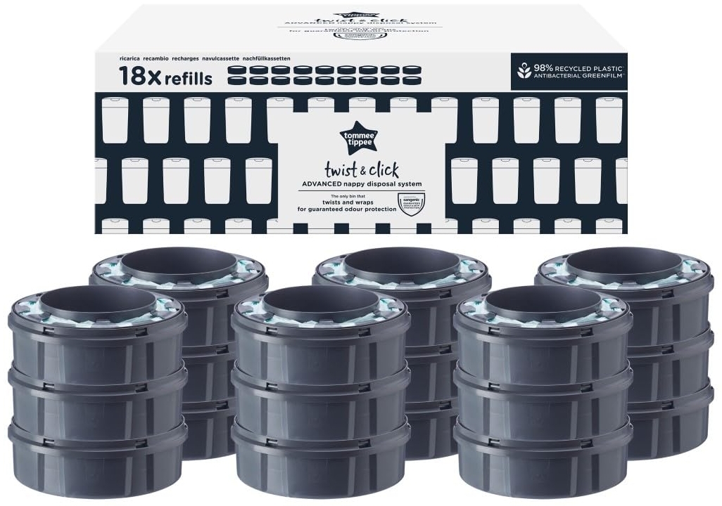 **Tommee Tippee 18er Pack Nachfüllkassetten Greenfilm Folie für Twist & Click Windeleimer** **Features:** Garantierter Schutz vor Gerüchen: Die Windeln werden einzeln eingedreht, sodass unangenehme Gerüche nicht nach außen dringen können – 100-mal wirksamer als herkömmliche Windelbeutel. Garantierter Schutz vor Keimen: Bei Berührung tötet die mehrlagige antibakterielle GREENFILM™-Folie 99 % aller gefährlichen Keime wie E. coli und Staphylococcus aureus ab. Umweltschonender***: Twist & Click Windeleimer und Nachfüllkassetten sind aus 98 % recyceltem, vollständig recycelbarem Kunststoff und antibakterieller GREENFILM™-Folie aus nachhaltigem Zuckerrohr. Optimaler Schutz: Für eine optimale Funktion und garantierten Schutz vor Gerüchen und Keimen solltest du für deinen Twist & Click Windeleimer nur original Twist & Click Nachfüllkassetten verwenden. Twist & Click und Sangenic TEC – die Twist & Click Nachfüllkassetten von Tommee Tippee sind für alle Twist Windelentsorgungssysteme von Tommee Tippee geeignet: Twist & Click und Sangenic TEC. **Beschreibung:** Dafür, dass dein Baby noch so klein ist, ist das, was es produziert, nicht ohne! Der Twist & Click Windeleimer von Tommee Tippee ist das einzige Entsorgungssystem, das jede Windel einzeln eindreht, sodass unangenehme Gerüche und Keime sicher eingeschlossen werden. So bleibt dein Zuhause sauber und frei von Gerüchen. Die mehrlagige antibakterielle GREENFILM™-Folie ist 100-mal wirksamer als Windelbeutel, da sie mit Biomaster** ausgestattet ist und 99 % aller gefährlichen Keime wie E. coli und Staphylococcus aureus abtötet. Bei Berührung verhindert sie, dass Proteine durch Bakterien zersetzt werden – ein Prozess, der für viele unangenehme Gerüche verantwortlich ist. Der dicht schließende Deckel des Twist & Click Windelentsorgungssystems schließt alle unangenehmen Gerüche ein, denn der integrierte Stopfer drückt die Windel tief in den Eimer – deine Hände bleiben sauber. Die Twist & Click Nachfüllkassetten von Tommee Tippee sind für alle Twist-Windelentsorgungssysteme von Tommee Tippee – Twist & Click und Sangenic TEC – geeignet. Jede Nachfüllpackung enthält genug antibakterielle Folie für die Windeln eines ganzen Monats*, je nach verwendeter Größe und Anzahl. Aus Umweltschutzgründen bestehen der Twist & Click Windeleimer und die Nachfüllkassetten aus 98 % recyceltem und vollständig recycelbarem Kunststoff. Unsere mehrlagige antibakterielle GREENFILM™-Folie ist jetzt biobasiert und besteht aus nachhaltig bezogenem Zuckerrohr. Um eine optimale Funktion und zuverlässigen Schutz vor Gerüchen zu garantieren, solltest du für deinen Twist & Click Windeleimer nur original Twist & Click Nachfüllkassetten von Tommee Tippee verwenden. *Basierend auf Windelgröße 1 (2–5 kg) **Lediglich die Folie bietet einen antibakteriellen Schutz, nicht jedoch die anderen Bestandteile dieses Produkts. Die Folie wurde gemäß ISO 22196-2011 mit Biomaster-Silberbiozid behandelt. Biozide verantwortungsbewusst verwenden. ***53% reduzierter CO2-Fußabdruck im Vergleich zum originalen Twist & Click-System