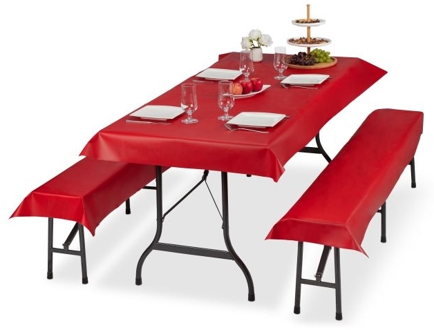 Beschreibung Die abwaschbaren Bierzeltgarnitur Auflagen von Relaxdays schützen und verschönern Ihre Bierbankgarnitur. Das 3er Set besteht aus einer Tischdecke (250x100cm) und 2 Bankauflagen (je 250x55cm). Passend für alle gängigen Bierzeltgarnituren, sind sie perfekt für jeden Anlass. **Highlights** - Schützt und wertet Bierbankgarnituren auf - Abwaschbar und wiederverwendbar - Passend für alle gängigen Bierzeltgarnituren **Produkteigenschaften** - Farbe: Rot - Maße: Tischdecke 250x100cm, Bankauflagen je 250x55cm - Material: Abwaschbar und wasserabweisend