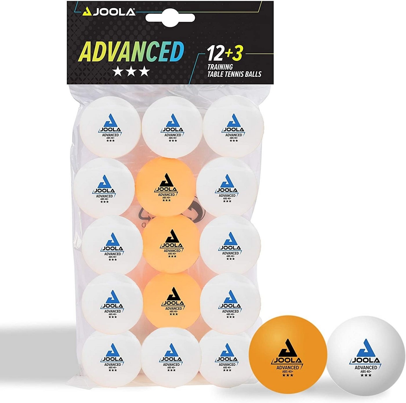Joola 12+,3 Tischtennisbälle Advanced Training *** Die selektierten Tischtennisbälle besitzen perfekte Spieleigenschaften und eignen sich für Freizeit- und auch für Vereinsspieler. Ein extrem guter Ballabsprung, einer sehr hohe Spinnannahme und eine lange Haltbarkeit zeichnen diesen Tischtennisball aus. Die JOOLA Trainingsbälle mit Naht werden aus hartem ABS Plastik hergestellt. Sie entsprechen den neusten ITTF Wettkampfanforderungen. Erhältlich ist der JOOLA ADVANCED TRAINING*** als Verpackungseinheit mit 12 weißen Bällen und zusätzlich 3 orangenen Bällen.