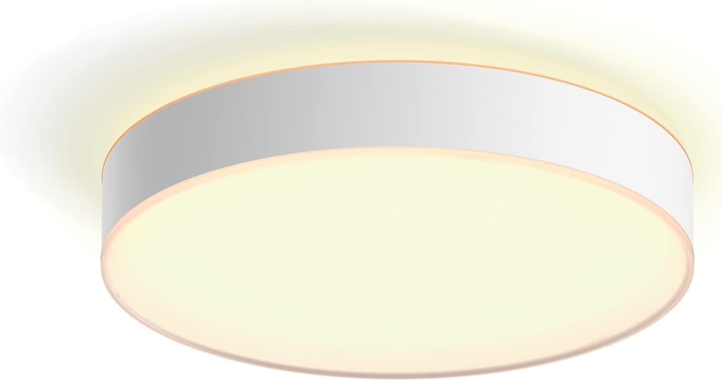 Beschreibung Die große Hue Enrave Deckenleuchte in Weiß eignet sich für größere Räume wie das Wohnzimmer. Sie wirft einen dezenten Lichtring an die Decke und ein kräftiges Licht nach unten. So füllt sie den Raum mit sanften Schattierungen von warm- bis kaltweißem Licht. Inklusive Dimmschalter. Hue White Ambiance Deckenleuchte, 33,5W, LED, 2200-6500 Kelvin, 4300 Lumen, Steuerung mit deinen smarten Geräten durch Verbindung mit einer Hue Bridge (nicht enthalten), Hue Bluetooth oder einem Hue Dimmer Switch, Sprachsteuerung mit Google Home, Alexa oder Siri, weiß, groß.