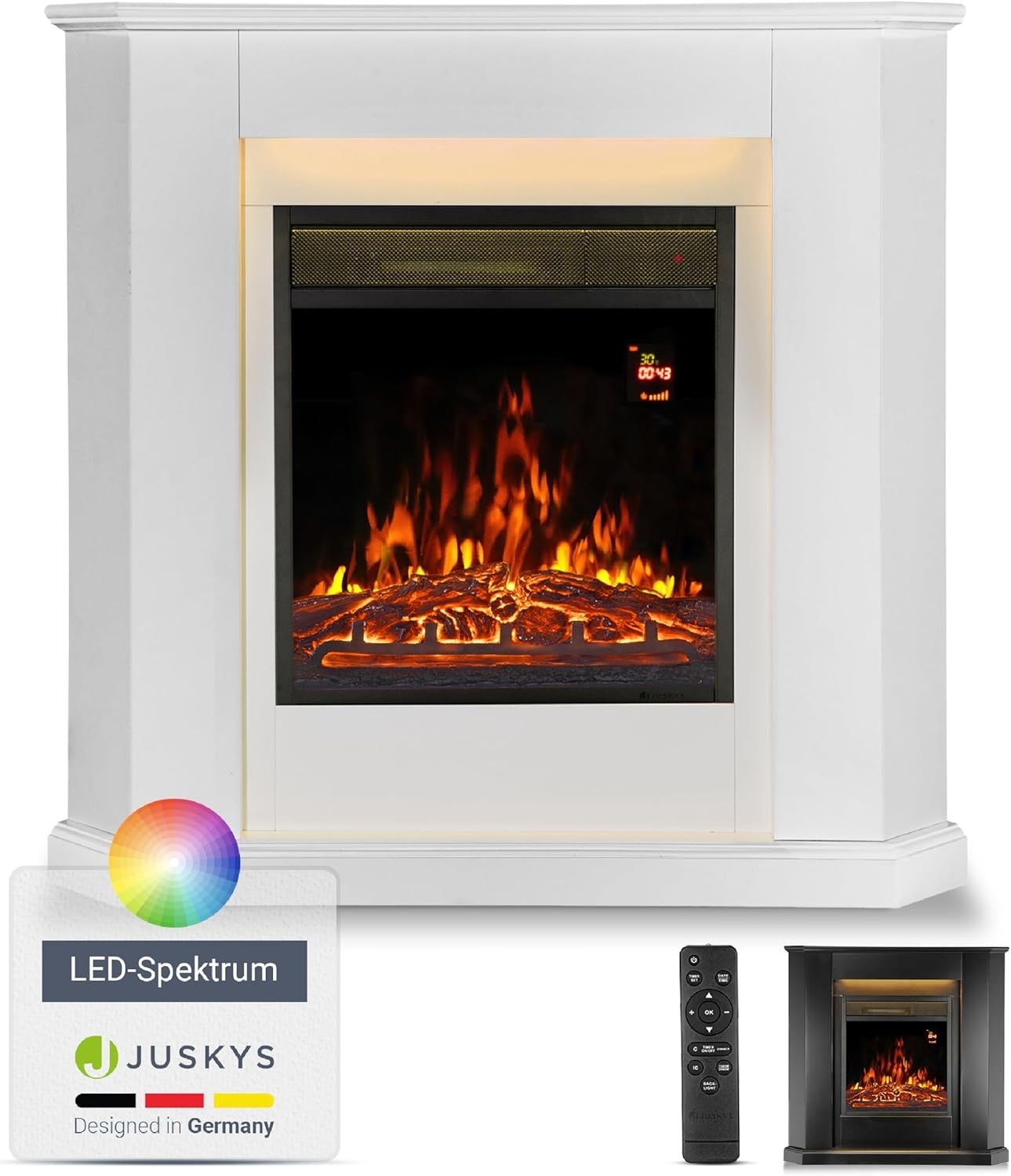 | Name | Juskys Elektrokamin 1000 / 2000 W mit Heizung, Kaminfeuer, Flammeneffekt, Fernbedienung, LED Beleuchtung - Elektrischer Kamin Eckkamin weiß |