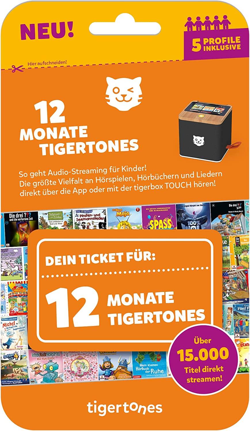 Sonstige Handelsware Mit dem tigertones-Ticket wird Streaming zum Kinderspiel!: Für 12 Monate erhältst Du unbegrenzten Zugriff auf mehr als 15. 000 Hörspiele, Hörbücher und Kinderalben und kannst deine Lieblingshelden auf ihre Abenteuer begleiten und in neue, spannende Welten eintauchen! Das tigertones-Ticket ist am besten erlebbar mit der tigerbox TOUCH! Im Lieferumfang enthalten sind die tigerbuddies, USB-C Ladekabel, USB-C Audiokabel und ein 14-Tage-tigertones Ticket mit Zugang zu über 15. 000 Hörspiele, Hörbücher und Musik für Kinder.