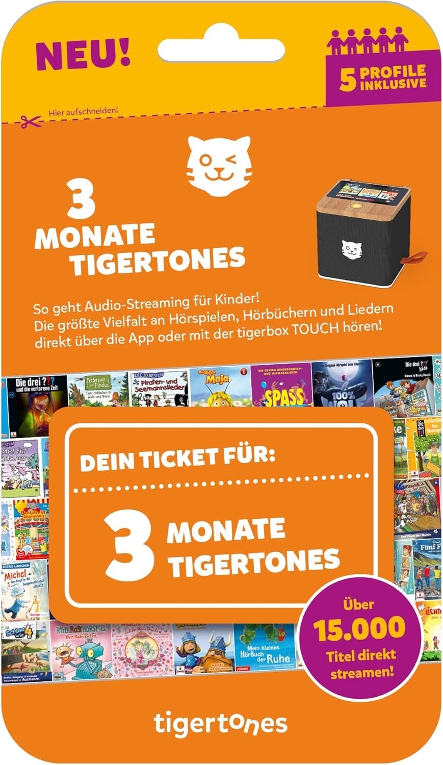 Mit dem tigertones-Ticket wird Streaming zum Kinderspiel! Für 3 Monate erhältst Du unbegrenzten Zugriff auf mehr als 15. 000 Hörspiele, Hörbücher und Kinderalben und kannst deine Lieblingshelden auf ihre Abenteuer begleiten und in neue, spannende Welten eintauchen! Das tigertones-Ticket ist am besten erlebbar mit der tigerbox TOUCH! Lieferumfang: 1 tigerticket - 3 Monate Riesige Auswahl: Hörspiele, Hörbücher und Kinderlieder mit vielen bekannten Kinderhelden im Stream Bis zu 5 Profile einrichten und in tigertones sowei auf der tigerbox TOUCH nutzen Einstellmöglichkeiten zu Themen, Alter, Lieblingsheldinnen und -helden Volle Kostenkontrolle: Unbegrenzter Zugang auf alle Inhalte ohne zusätzliche Kosten Sorgfältig geprüfte Inhalte Absolut Werbefrei: Keine Kaufanreize für eine sorgenfreie Nutzung für Kinder - ganz ohne einen Erwachsenen Funktioniert nur in Kombination mit der tigerbox TOUCH (separat erhältlich) Altersempfehlung: 4-12 Jahre Hersteller: Tiger Media Hersteller Art. Nr. : 4212