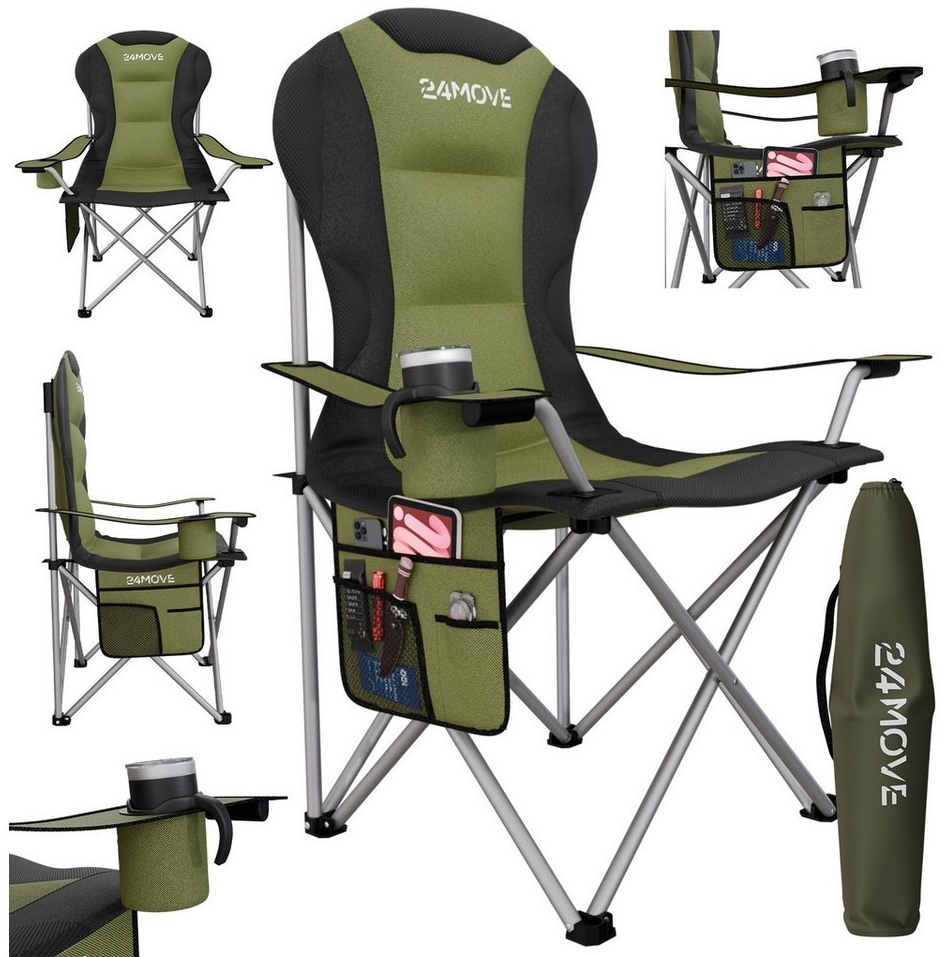 | Name | 24Move Campingstuhl Campingstuhl faltbar inkl. Tragetasche, bis 150kg belastbar, grün (bequeme Arm- und Rückenlehne), Gartenstuhl, Klappstuhl gepolstert |