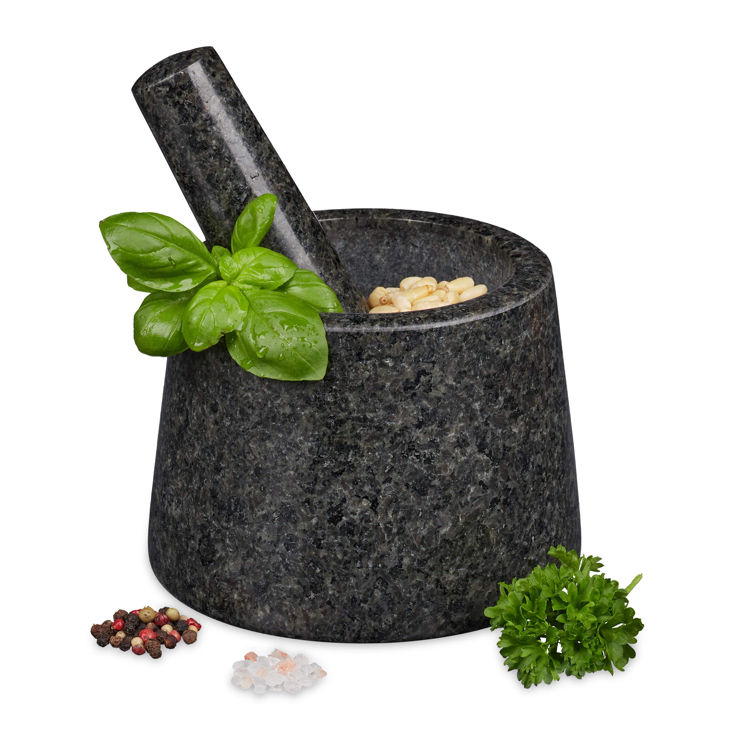 - Der Relaxdays Mörser mit Stößel besteht aus langlebigem, massivem Granit, der eine schicke Optik bietet.