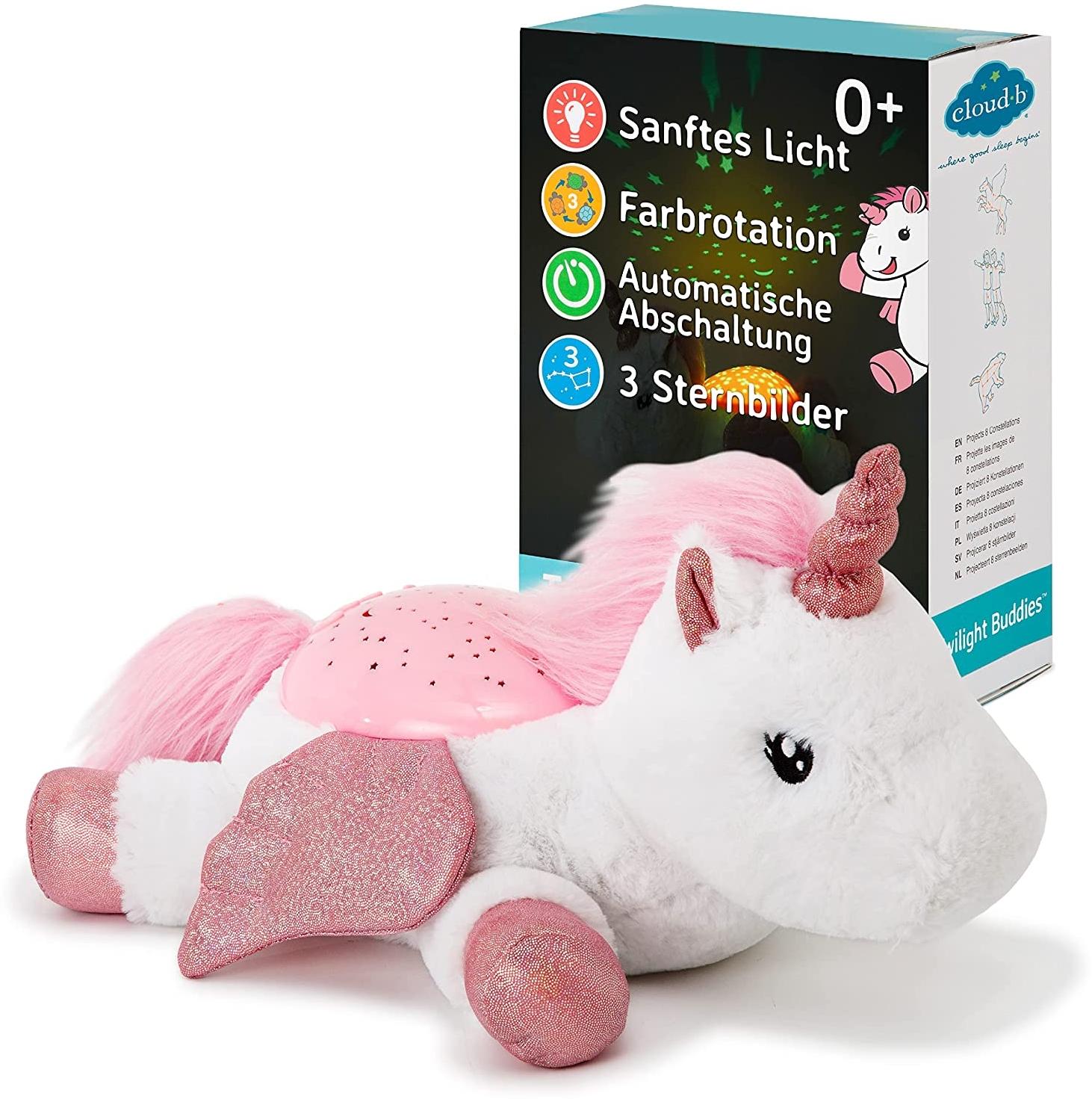 \"Cloud B Twilight Buddie - Einhorn: Das niedliche Einhorn projiziert Sterne und Mond an Decke und Wände und verwandelt diese in einen zauberhaften Sternenhimmel. Die drei besänftigenden Farben schaffen eine magische und beruhigende Umgebung. So mildert das Einhorn die Angst vor der Dunkelheit und wird dadurch ganz schnell der Liebling Ihres Kindes. Über das kleine Heft können Sie sich auch gemeinsam mit Ihrem Kind die Sternbilder entdecken. Details:: Plüschtier mit LED Nachtlicht , Projiziert Sterne an Decke und Wände, Drei Farben wählbar: blau, grün, bernstein-gelb, Auch für hohe Decken geeignet, Automatischer Farbwechsel möglich, Mit Sternbildern und Sternenkarte, Nach 45 Min. automatisch aus, Drei AAA-Batterien enthalten, Für alle Altersgruppen, Maße: 30 x 15 x 15 cm. \"