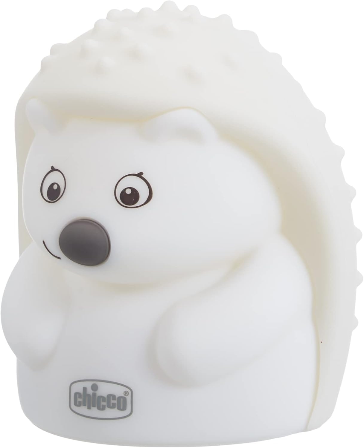 Chicco Nachtlicht in Form eines niedlichen Igel. Dieses süße Nachtlicht beruhigt Ihr Baby beim Einschlafen mit mehrfarbigen Lichteffekten. Hergestellt aus weichem Silikon, ist es angenehm zu berühren und sicher in der Anwendung, da es sich nicht erhitzt. Das Nachtlicht ist aufladbar und ideal, um eine beruhigende Atmosphäre zu schaffen. **Highlights** - Niedliche Leuchtfigur in Igel-Form - 8 mehrfarbige Lichteffekte für eine beruhigende Atmosphäre - Hergestellt aus weichem Silikon für angenehme Haptik - Sicher, da die LED-Lichter sich nicht erhitzen - Aufladbar mit mitgeliefertem USB-Kabel **Produkteigenschaften** - Freistehend - Ideal für Jungen und Mädchen - Unterstützt einen ruhigen Schlaf **Lieferumfang** - Nachtlicht - USB-Kabel