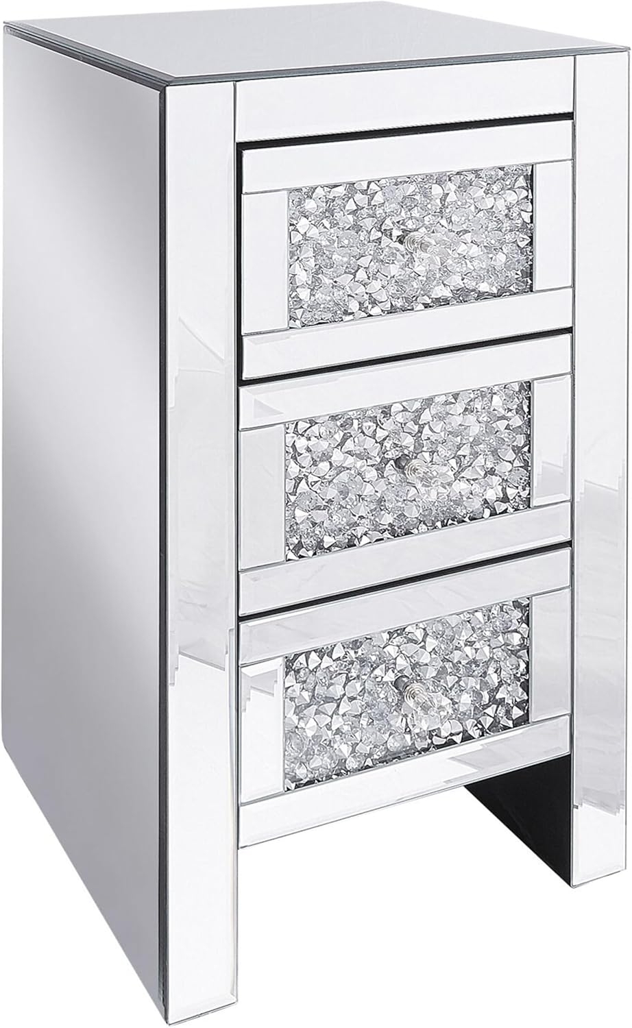 Glamouröser Nachttisch mit Spiegeleffekt und 3 Schubladen. Die verspiegelten Fronten und Diamantgriffe verleihen ihm ein modernes Aussehen. Praktisch und stilvoll, ideal für Ihr Schlaf- oder Wohnzimmer. Die Schubladen mit Kristallbesatz sorgen für Ordnung, während die Glas-Tischfläche Platz für Deko bietet. Ausgestattet mit einem Soft-Close-System für geräuschloses Schließen. **Highlights** - System des stillen Schließens von Schubladen: Geräuschloses Schließen für ungestörte Nächte - Elegantes Design: Modern und glamourös mit verspiegelter Oberfläche - Verspiegelte Oberfläche: Luxuriöser Look für das Interior - Schutzkappen zum Schutz des Bodens: Verhindert Kratzer und Beschädigungen - Zusätzlicher Stauraum: 3 Schubladen für mehr Ordnung **Produkteigenschaften** - Typ: Nachttisch - Stil: Glamourös - Farbe: Silber - Material: Glas, MDF-Platte, Holzwerkstoff - Schubladen: 3 - Finish: Poliert - Maße: 60 cm (Höhe) x 30 cm (Breite) x 30 cm (Tiefe) - Gewicht: 13 kg - Max. Belastung der Schublade: 8 kg - Max. Belastung der Oberplatte: 10 kg - Keine Montage erforderlich **Lieferumfang** - 1 x Nachttisch - Exklusive Dekoartikel und Kosmetikartikel