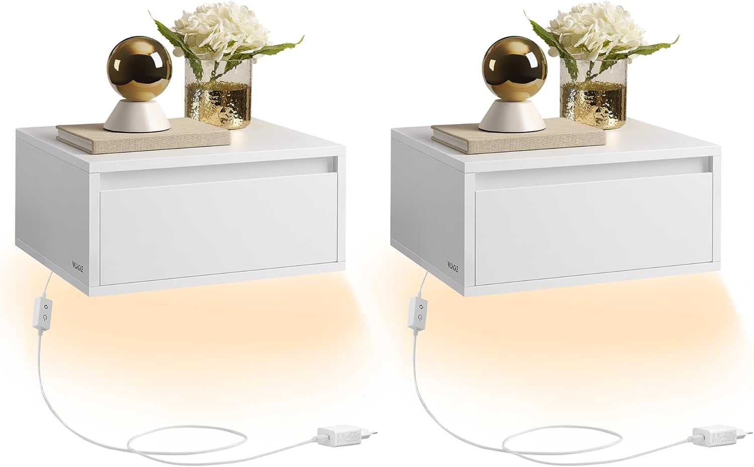 Präsentieren Sie Ihren Raum mit dem Vasagle 2er-Set Nachttisch, der durch sein schwebendes Design und die integrierte Lichtleiste besticht. Mit den Maßen 35 x 40 x 18 cm (T x B x H) und einer maximalen statischen Belastbarkeit von 50 kg pro Nachttisch, bietet er sowohl Funktionalität als auch Stil. Die komfortable Schublade sorgt für Ordnung, während die drei einstellbaren Lichtfarben eine gemütliche Atmosphäre schaffen. **Highlights** - Schwebendes Design: Passt sich der Höhe Ihres Bettes an und bietet Platz für die Reinigung. - Ausgestattet mit Licht: Schafft eine sichere Umgebung in der Nacht und verfügt über 3 Farben, um verschiedene Stimmungen zu schaffen. - Komfortable Schublade: Verbirgt Unordnung und ermöglicht schnellen Zugriff. - Minimalistisches Design: Passt gut zu verschiedenen Einrichtungsstilen. - Vielseitig einsetzbar: Kann auch als Regal oder in Kombination mit weiteren Schubladen verwendet werden. **Produkteigenschaften** - Farbe: Wolkenweiß - Material: Holzspanplatte, MDF (Mitteldichte Faserplatte) - Größe pro Nachttisch: 35 x 40 x 18 cm (T x B x H) - Gewicht insgesamt: 12,4 kg - Max. statische Belastbarkeit pro Nachttisch: 50 kg **Lieferumfang** - 2 x Schwebende Schublade - 1 x Zubehörpaket - 1 x Anleitung