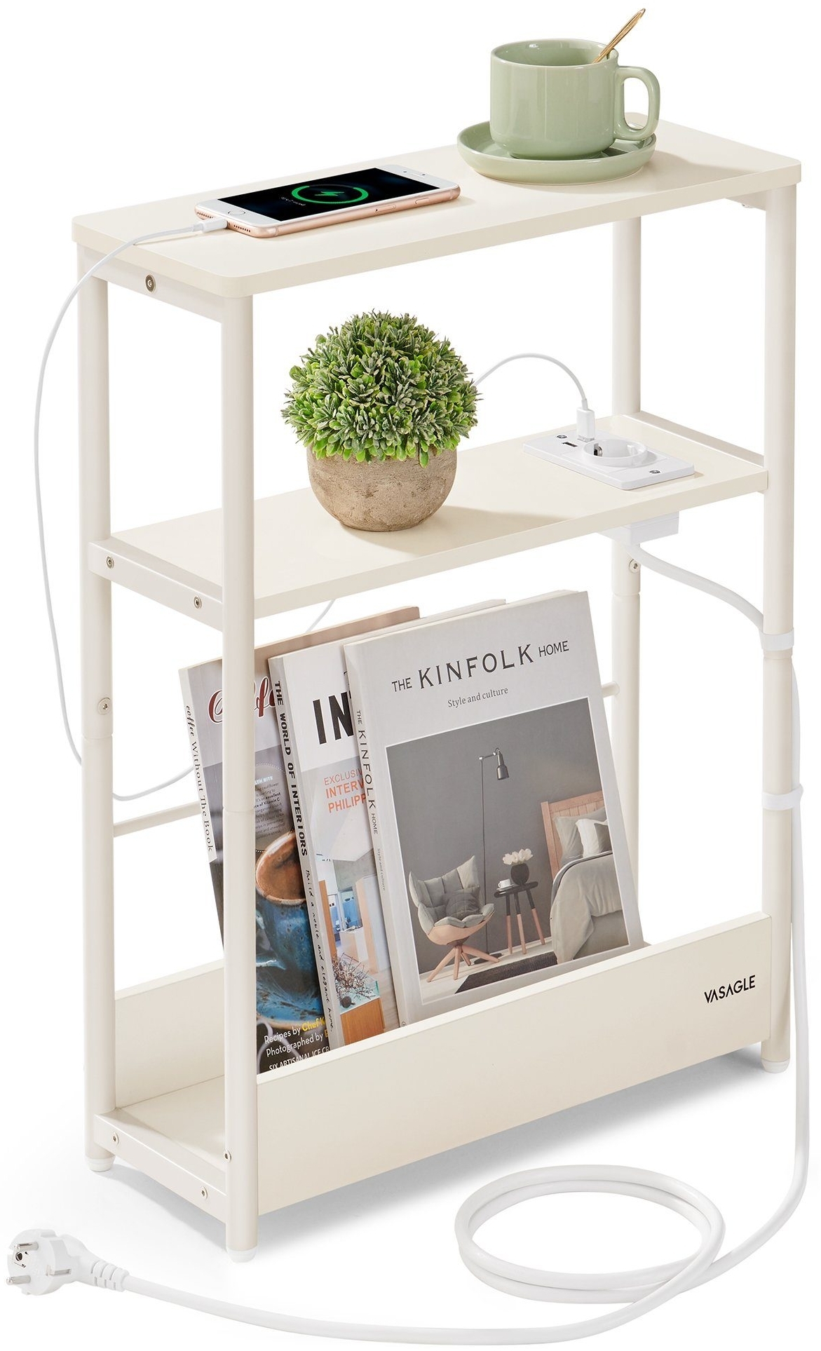 - **\[Für kleine Räume\]** Mit einer Größe von 18 x 45 x 58 cm können Sie diesen schmalen 3-stufigen Nachttisch einfach in einen engen Raum, wie z. B. neben Ihr Sofa oder Ihr Bett stellen, und so den begrenzten Platz optimal ausnutzen - **\[Eingebaute Ladestation\]** Mit 1 AC-Anschluss und 2 USB-Anschlüssen ermöglicht es der schlanke Beistelltisch, dass Sie Ihr Handy, Ihren Tablet-PC und andere Geräte gleichzeitig aufladen. Dank des 2 m langen Kabels können Sie den Tisch flexibel platzieren - **\[Vielseitiger Stauraum\]** Ob als Zeitschriftenständer für Ihre Lektüre oder als Beistelltisch für Ihre Alltagsutensilien, dieser multifunktionale Couchtisch mit 3 Ablagen erfüllt alles, was Sie benötigen - **\[Stark und zuverlässig\]** Mit seinem robusten Stahlrahmen und den hochwertigen Holzspanplatten ist dieser Beistelltisch bis zu 100 kg belastbar und bietet einen stabilen Halt für Ihre täglichen Utensilien - **\[Schnelle und einfache Montage\]** Dank der gekennzeichneten Teile und der klaren Anleitung ist der Aufbau des Nachttisches ein Kinderspiel. In nur wenigen Minuten können Sie sich an diesem praktischen und stilvollen Couchtisch erfreuen **Produktdetails:** - Farbe: Cremeweiß - Material: Holzspanplatte, Stahl - Größe: 18 x 45 x 58 cm (T x B x H) - Gewicht: 4,4 kg - Max. statische Gesamtbelastbarkeit: 100 kg **Lieferumfang:** - 1 x Nachttisch mit Steckdose - 2 x Band zum Kabelmanagement - 1 x Zubehörpaket - 1 x Anleitung **VASAGLE Hinweise:** - Bitte überschreiten Sie das Maximalgewicht dieses Beistelltischs nicht.