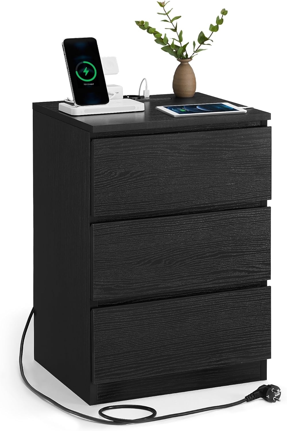 Der 'Vasagle' Nachttisch vereint Funktionalität und modernes Design. Mit 3 Schubladen und einer praktischen Ladestation, bestehend aus 2 AC-Steckdosen und 2 USB-Anschlüssen, bietet er ausreichend Stauraum und ermöglicht das Laden Ihrer Geräte direkt vom Bett aus. Hergestellt aus stabilen 15 mm dicken Holzspanplatten, trägt er bis zu 62 kg und fügt sich mit seiner ebenholzschwarzen Farbe elegant in jedes Wohnambiente ein. **Highlights** - Praktische Ladestation mit 2 AC-Steckdosen und 2 USB-Anschlüssen - Viel Stauraum durch 3 leicht zu öffnende Schubladen - Modernes, minimalistisches Design mit unsichtbaren Griffen - Langlebig und stabil, max. statische Gesamtbelastbarkeit: 62 kg - Einfache Montage dank klarer Anleitung **Produkteigenschaften** - Farbe: Ebenholzschwarz - Material: Holzspanplatte - Maße (T x B x H): 35 x 40 x 59 cm - Gewicht: 13 kg **Lieferumfang** - 1 x Nachttisch - 1 x Zubehörpaket - 1 x Anleitung