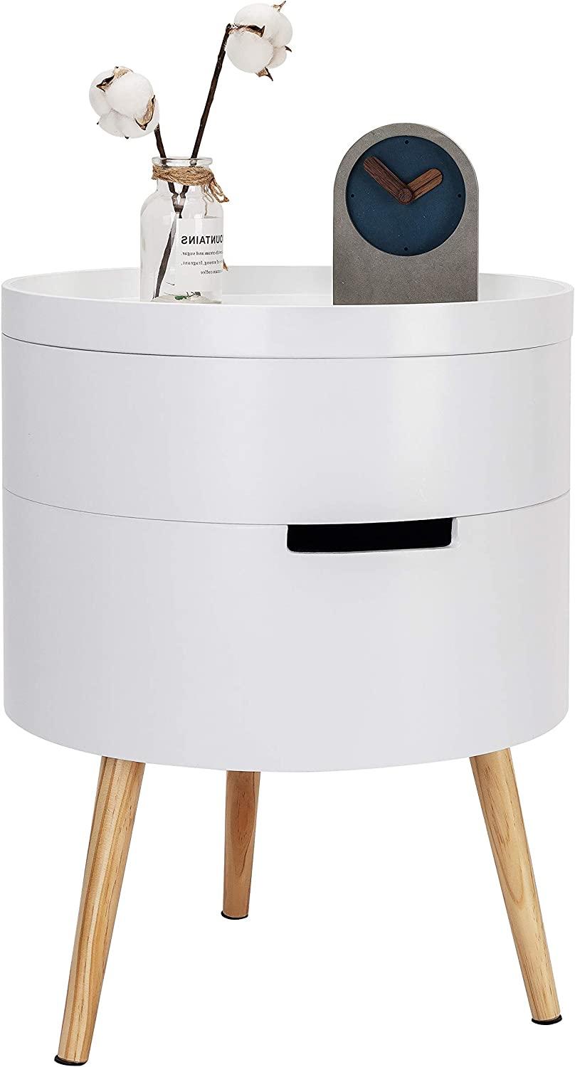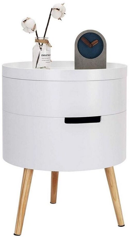 Ein stilvoller und funktionaler Beistelltisch aus weißem Holz mit Stauraum. Das runde Design und die Kombination aus Weiß und Naturholz passen perfekt zu verschiedenen Einrichtungsstilen. Mit 3 Ebenen bietet dieser skandinavische Nachttisch genügend Platz für Bücher, Snacks und persönliche Gegenstände. Einfache Montage ohne Werkzeug. Hergestellt aus langlebigem E1 MDF und stabilen Kiefernholzbeinen. Platzsparend und vielseitig einsetzbar in Schlafzimmer, Wohnzimmer und mehr. **Highlights** - Vielseitige Nutzungsmöglichkeiten als Beistelltisch, Couchtisch oder Aufbewahrungsbox - Großzügiger Stauraum mit 3 Ebenen für verschiedene Gegenstände - Einfache und werkzeuglose Montage - Stabile Konstruktion aus langlebigem E1 MDF und Kiefernholz - Platzsparendes Design für kleine Räume **Produkteigenschaften** - Maße: 38 x 49 x 38 cm - Material: E1 MDF, Kiefernholz - Gewicht: ca. 4,3 kg - Farbe: Weiß - Stil: Skandinavisch - Stabile dreieckige Struktur für Tragfähigkeit - Leicht zu reinigen und wasserabweisend - Abgerundete Kanten für Sicherheit und Stil
