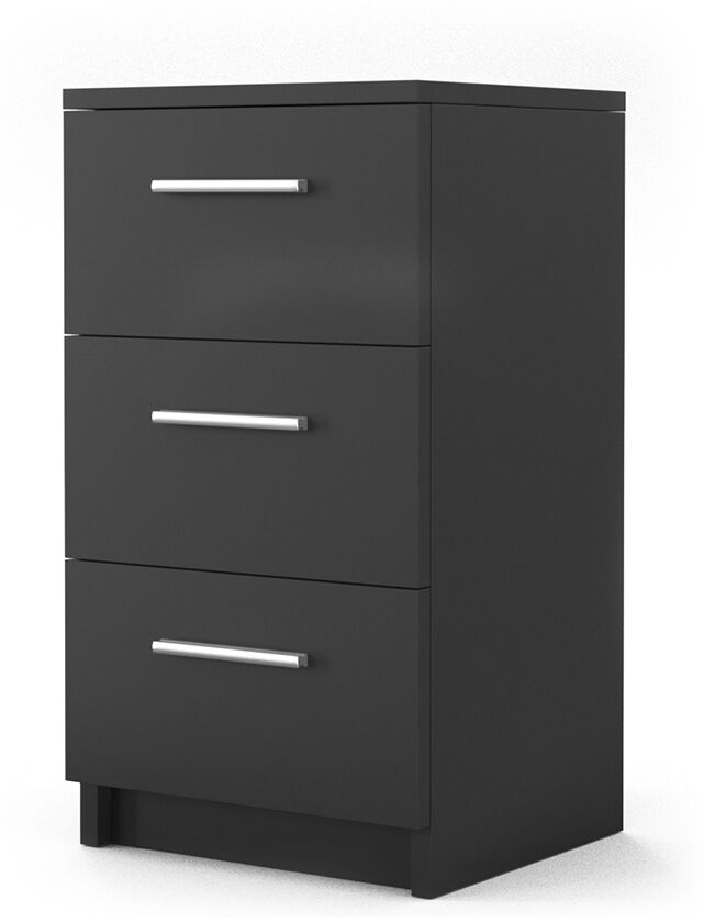 Der Vicco Nachttisch in Schwarz ist die ideale Ergänzung für Ihr Schlafzimmer. Mit den Abmessungen 38 x 66 x 35 cm (BxHxT) und drei geräumigen Schubladen bietet er ausreichend Stauraum für Ihre wichtigsten Gegenstände. Hergestellt aus pflegeleichter Spanplatte mit einer Melaminharzbeschichtung, vereint dieser Nachtschrank modernes Design und Funktionalität. Er ist perfekt für Boxspringbetten geeignet und sorgt für Ordnung und Stil in Ihrem Raum. **Highlights** - Modernes Design für stilvolle Schlafzimmergestaltung - Drei geräumige Schubladen für optimalen Stauraum - Hergestellt aus pflegeleichter Spanplatte - Melaminharzbeschichtung für eine langlebige Oberfläche - Ideal für Boxspringbetten **Produkteigenschaften** - Farbe: Schwarz - Abmessungen: 38 x 66 x 35 cm (BxHxT) - Material: Spanplatte, 16 mm - Gewicht brutto: 18,78 kg - Artikelgewicht inkl. Verpackung: 17,2 kg - Artikelgewicht: 16,21 kg **Lieferumfang** - Nachttisch - Montageanleitung - Montagematerial
