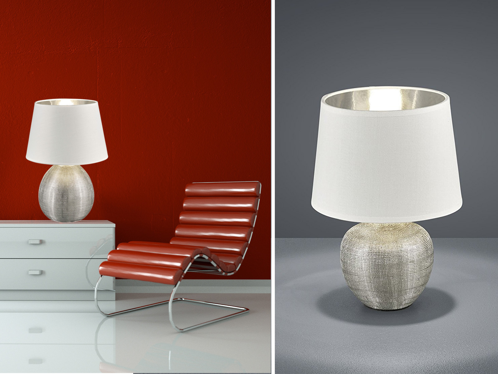 Die elegante Tischleuchte LUXOR ist ein wahrer Blickfang in jedem Wohnbereich. Mit einem Durchmesser von 24 cm und einer Höhe von 35 cm eignet sie sich ideal für Sideboards, Flure oder als Akzentlicht im Schlafbereich. Der silberfarbige Keramikfuß harmoniert perfekt mit dem weißen Stoffschirm, der innen ebenfalls silberfarbig gestaltet ist. Für eine energiesparende Beleuchtung empfehlen wir die Verwendung eines LED-Leuchtmittels, das eine hohe Lichtqualität und eine Energieeinsparung von bis zu 80 % bietet. **Highlights** - Elegantes Design mit silberfarbigem Keramikfuß - Stoffschirm in Weiß mit silberfarbigem Innenleben - Schnurschalter für einfache Bedienung - Geeignet für LED-Leuchtmittel zur Energieeinsparung - Hohe Lichtqualität und lange Lebensdauer der Leuchtmittel **Produkteigenschaften** - Material: Keramik / Stoff - Farbe: silber / weiß - Maße (H x Ø): 35x24 cm - Fassung: 1 x E27, max. 60 W - Leuchtmittel nicht im Lieferumfang enthalten **Lieferumfang** - 1 Tischleuchte ohne Leuchtmittel