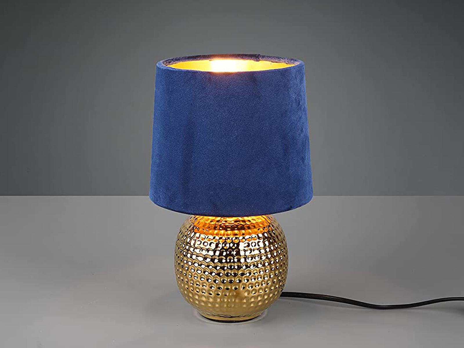 Die Tischleuchte SOPHIA vereint modernes Design mit Funktionalität. Mit einer Höhe von ca. 26 cm und einem Durchmesser von ca. 16 cm ist sie ideal für Nachttische oder Beistelltische. Der goldfarbige Keramikfuß und der blaue Samt-Schirm sorgen für eine stilvolle Atmosphäre. Der Schnurschalter ermöglicht eine einfache Bedienung. Für eine energiesparende Beleuchtung wird die Verwendung eines LED Leuchtmittels empfohlen. **Highlights** - Modernes Design in Gold und Blau: Stilvolle Kombination für ein modernes Erscheinungsbild - Warmes und sanftes Licht: Schafft eine angenehme Lichtstimmung im Raum - Schnurschalter: Einfaches Ein- und Ausschalten der Leuchte - Energiesparend: LED Leuchtmittel ermöglichen eine Energieeinsparung von bis zu 80% - Langlebig und umweltfreundlich: LED Leuchtmittel haben eine lange Lebensdauer und schonen die Umwelt **Produkteigenschaften** - Zustand: neu & originalverpackt - Typ: INDOOR - Technologie: Allgebrauchslampe - Merkmale: eingebauter Schalter, Schnurschalter - Material Korpus: Metall - Farbe Korpus: goldfarbig - Haupt Leuchtmittel Anzahl: 1 - Haupt Leuchtmittel Fassung: E14 - Höhe: ca. 26 cm - Durchmesser: ca. 16 cm - IP Klassifikation: IP20 - Empfohlene Leuchtmittel: 1 x E14 max. 40 Watt (nicht enthalten) **Lieferumfang** - Tischleuchte SOPHIA - Exklusive Leuchtmittel