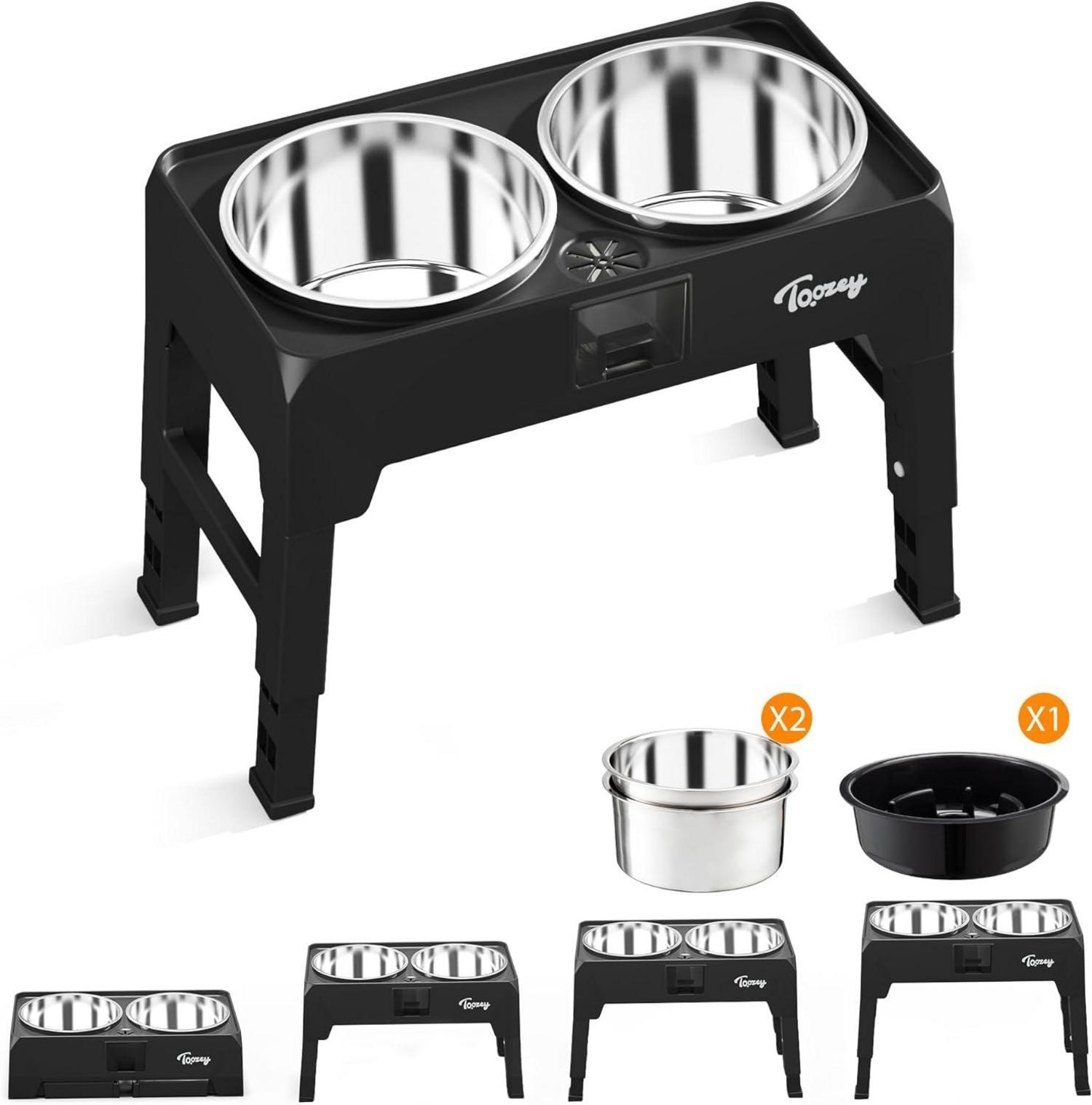 Der Toozey Hundenapf Erhöht bietet eine optimale Fütterungslösung für große Hunde. Mit zwei 2L Edelstahlnäpfen und einem höhenverstellbaren Ständer, der auf vier Höhen (12 cm, 26 cm, 30 cm, 34 cm) anpassbar ist, fördert er eine gesunde Esshaltung. Die rutschfesten Anti-Rutsch-Pads sorgen für Stabilität, während das Auffang-Schubladen-Design den Futterbereich sauber hält. **Highlights** - Reduziert Belastung von Nacken, Gelenken und Wirbelsäule - Zwei 2L/68OZ Edelstahlnäpfe für große Hunde - Anpassbar auf 4 verschiedene Höhen - Mit hochwertigen Anti-Rutsch-Pads für Stabilität - Perfekt geeignet für mittelgroße und große Hunde **Produkteigenschaften** - Maße (HxBxT): 12 cm / 26 cm / 30 cm / 34 cm - Material: Edelstahl - Langsamfütterungs-Hundenapf mit 1,1L/37OZ **Lieferumfang** - 2x 2L Edelstahlnäpfe - 1x Langsamfütterungs-Hundenapf (1,1L/37OZ) - Hundenapfständer (höhenverstellbar)