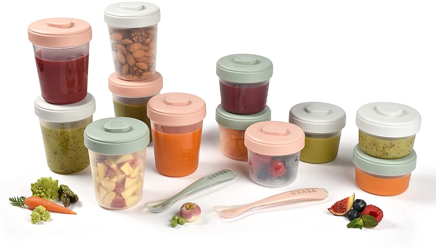 Béaba Clip-Portionsbehälter Set-komplett für die erste Mahlzeit Luftdicht und auslaufsicher punkten die tollen Béaba Clip-Portionsbehälter. Eine Kombination aus verschiedenen Größen und dem passenden Löffeln machen dir den Start für die erste feste Mahlzeit besonders einfach. * 100%ig auslaufsicher, luftdicht * platzsparend ineinander stapelbar * übereinander stapelbar dank der besonderen Deckelform ohne zu Verrutschen * inkl. Beschriftungsfeld und Füllmengen-Anzeige * Material: Polypropylen (PP), BPA frei * Verwendung in der Mikrowelle (ohne Deckel), Kühlschrank, Gefrierschrank, zum Erwärmen/Auftrauen im Babycook und Bib Expresso * Lieferumfang: 12 Behälter (2x90ml, 4x150ml, 6x250ml), 6 passende Deckel mit Clip, 2 Babylöffel Rundumsorglos-Paket ab der ersten Mahlzeit Die Portionsbehälter sind aus robustem Polypropylen gefertigt, sodass sich die Dosen prima für die Mikrowelle, den Gefrierschrank und die Spülmaschine eignen. Die 12 Dosen mit verschiedenen Füllmengen kannst du individuell befüllen – eine große Mittags-Mahlzeit, eine kleinere Portion Fruchtmus am Nachmittag und abends soll es die Portion Abendbrei werden. Ganz nach den Bedürfnissen deines Babys erfolgt die spielend leichte Verwendung der praktischen Béaba Portionsbehälter. Portionieren, Aufbewahren, Erwärmen, Einfrieren und Füttern Sie eignen sich hervorragend, um deine mit Liebe zubereitenden Mahlzeiten zu portionieren und anschließend im Kühlschrank oder Gefrierschrank zu lagern. Hat dein kleiner Gourmet Hunger geht es dann auch ganz schnell. Das Erwärmen funktioniert absolut problemlos in der Mikrowelle, deinem Babycool oder Bib Expresso. Nichts muss umgefüllt werden – vom Portionieren bis zum Servieren! Inklusive Babylöffel Mit dem extra schmalen und weichen Béaba Löffel stillst du den Hunger besonders babygerecht. Der schlanke weiche Löffel fühlt sich angenehm an, im kleinen Mund deines Kindes. Der lange Stiel eignet sich gut zum Füttern und du gelangst perfekt in jede Ecke des Portionsbehälters. Stabil stapelbar ineinander und übereinander Übereinander gestapelt benötigst du im Kühlschrank oder Froster nur wenig Platz und hast den perfekten Überblick. Die besondere Deckelform sorgt dabei für einen sicheren Stand. Nach Gebrauch kannst du sie platzsparend ineinander stapeln. Praktisches Beschriftungsfeld Besonders praktisch ist das Beschriftungsfeld auf jedem Behälter, sodass Sie, gerade wenn du eine Mahlzeit einfrieren möchtest, immer weißt, was sich in dem Behälter befindet. Dank der aufgedruckten Milliliter-Skala siehst du auf einen Blick, wie viel sich in dem Döschen befindet.