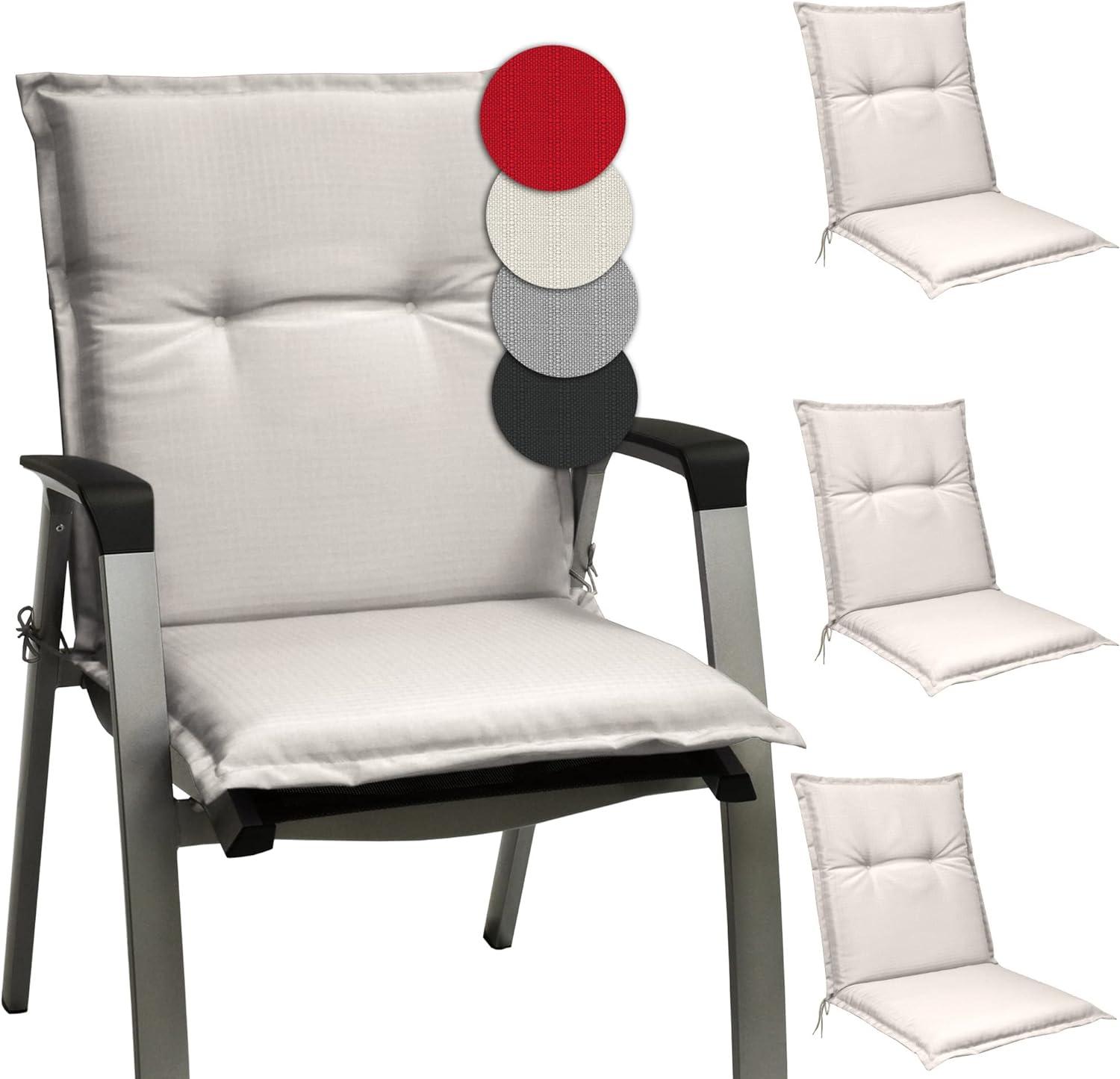 Die Beautissu Niedriglehner Auflagen im 4er Set verwandeln Ihre Gartenmöbel in bequeme Sitzgelegenheiten. Mit einer Abmessung von 100 x 50 x 6 cm und einer Polsterung von ca. 6 cm bieten sie optimalen Sitzkomfort. Der Bezug aus 100% Polyester sorgt für eine UV Lichtechtheit von 5, wodurch ein Ausbleichen durch Sonnenlicht verhindert wird. Ideal für die meisten Niedriglehner Gartenstühle und Multifunktions-Sessel. **Highlights** - Verwandeln Sie jeden Stuhl in eine bequeme Sitzgelegenheit - UV Lichtechtheit 5 für langanhaltende Farbbrillanz - Besonders weiche, ca. 6 cm starke Polsterung für idealen Sitzkomfort - Passend für die meisten Niedriglehner Gartenstühle und Multifunktions-Sessel - Stabiler Halt durch Befestigungsbänder **Produkteigenschaften** - Abmessungen: 100 x 50 x 6 cm (Länge x Breite x Höhe) - Material: 100% Polyester - UV Lichtechtheit: 5 - Stoffqualität: 160 g/m² - Füllung: gepolsterte 100% Polyurethan Schaumplatte mit Polyestervlies ummantelt - STANDARD 100 by OEKO-TEX unter der Prüfnummer 17.HGB.26231 HOHENSTEIN HTTI **Lieferumfang** - 4x Niedriglehner Auflage Base NL in Natur - Stuhl nicht im Lieferumfang enthalten