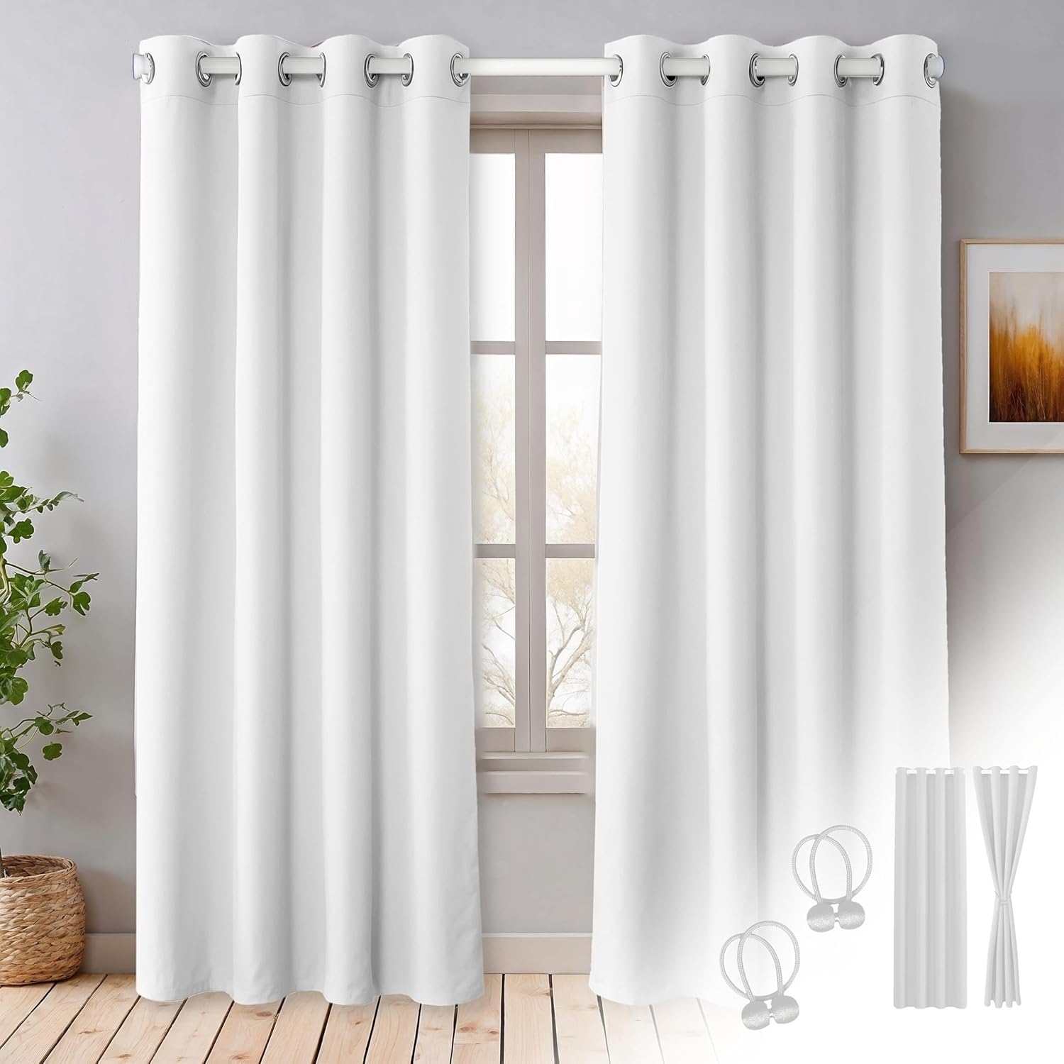 Cozyor Vorhang weiß 2er Set + 2 Raffhalter - Gardine mit Ösen wahlweise mit Stange (2 St), Ösen, blickdicht, 100% Polyester, Gardinen Thermo Vorhang 160x135 Wohnzimmer, Schlafzimmer, Kinderzimmer