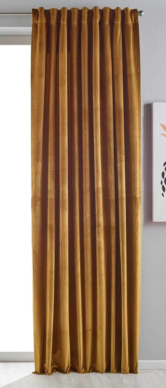 Der Vorhang »Milano« aus schwerem Samt bietet Ihnen eine elegante Fensterdekoration mit optimalem Sichtschutz. Der blickdichte Stoff hat eine Grammatur von ca. 320 g/m² und sorgt für eine effektive Verdunkelung von bis zu 88 % bei dunklen Farben. Mit einem Tunneldurchzug und Schlaufenband ist der Vorhang einfach zu befestigen und kann auf die gewünschte Länge gekürzt werden. **Highlights** - Blickdicht: Bietet optimalen Sichtschutz und schafft eine gemütliche Atmosphäre. - Verdunkelung: Reduziert Lichtdurchlässigkeit um bis zu 88 % bei dunklen Farben. - Schwerer Stoff: Mit ca. 320 g/m² für zusätzliche Wärmeisolierung. - Pflegeleicht: Waschbar bis 40 Grad und chlorfrei. - Tunneldurchzug: Einfache Befestigung und Kürzbarkeit. **Produkteigenschaften** - Maße (HxB): 280x135 cm - Material: 100 % Polyester - Farbe: Senf - Befestigung: Tunneldurchzug und Schlaufenband - Verdunkelung: 88 % bei dunklen Farben, 75 % bei Weiß und Sand **Lieferumfang** - 1 Stück mit Raffhalter