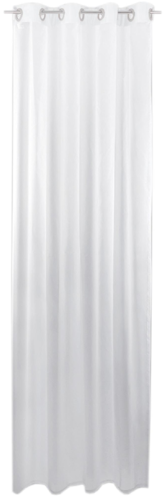 Die transparente Gardine mit Ösen in reinweiß (140x145 cm) verleiht jedem Raum eine schlichte Eleganz. Der hauchzarte Voile-Stoff sorgt für einen geschmeidigen Faltenfall und bietet tagsüber einen dezenten Sichtschutz, während Sie nach draußen einen optimalen Durchblick haben. Hergestellt aus 100 % pflegeleichtem Polyester, ist der Ösenschal bei bis zu 30 °C maschinenwaschbar. **Highlights** - Dezenter Sichtschutz: Schützt vor unerwünschten Blicken tagsüber. - Stilvolles Wohnaccessoire: Verschönert jedes Zimmer mit klassischer Eleganz. - Pflegeleicht: Aus 100 % Polyester, maschinenwaschbar bei 30 °C. - Geschmeidiger Faltenfall: Hauchzarter Voile-Stoff für einen eleganten Look. - Vielseitige Verwendung: Geeignet für verschiedene Gardinenstangen und Seilspanngarnituren. **Produkteigenschaften** - Maße (BxL): 140x145 cm - Material: 100 % Polyester - Ösen-Durchmesser: ca. 4 cm - Lichtschutz: Angenehme Blendreduzierung bei Tageslicht - Pflegehinweis: Maschinenwaschbar bei 30 °C