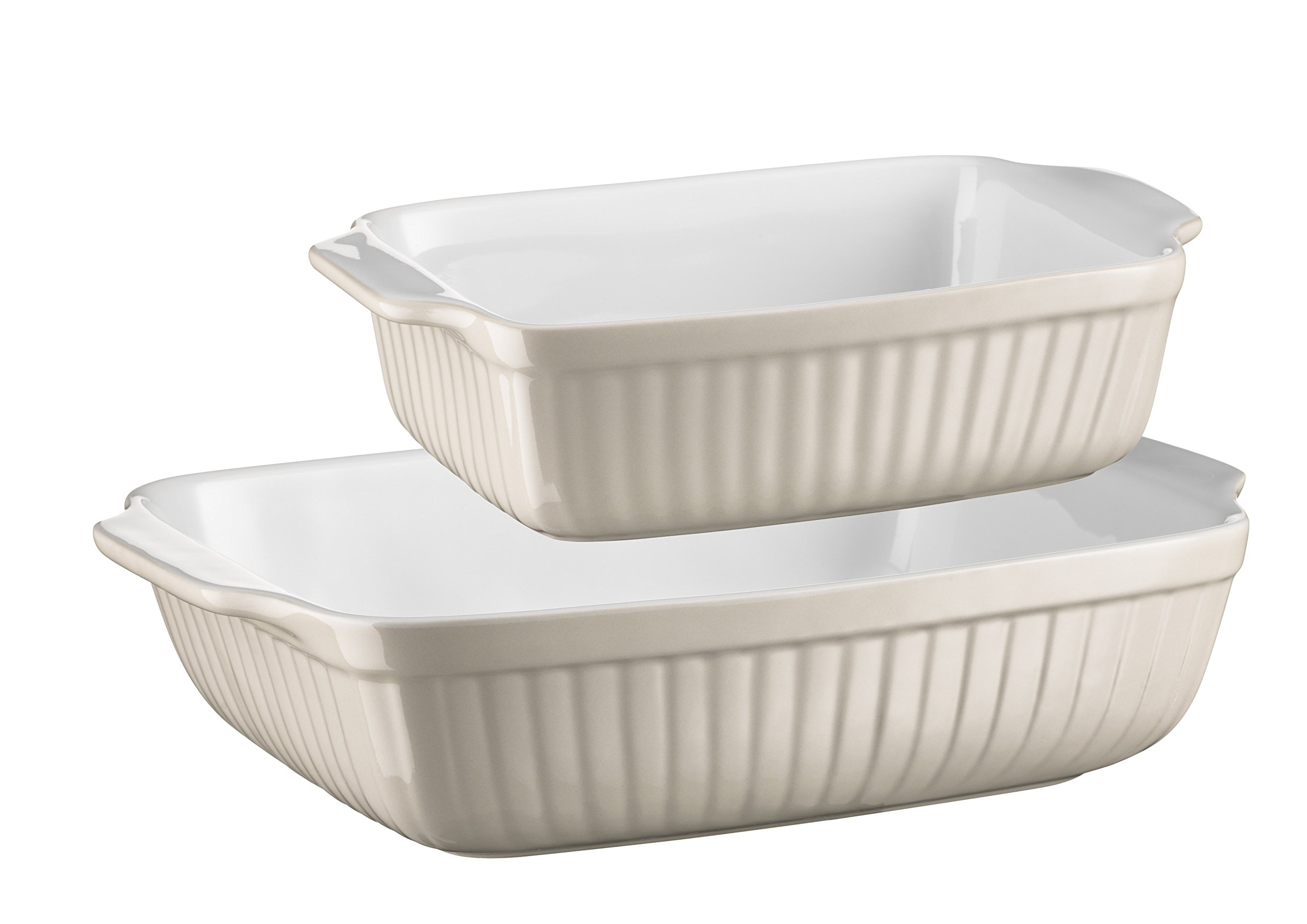 - Das Set besteht aus zwei rechteckigen Auflaufformen aus dickwandiger Keramik, die ideal für Gerichte wie Lasagne und Tiramisu sind.