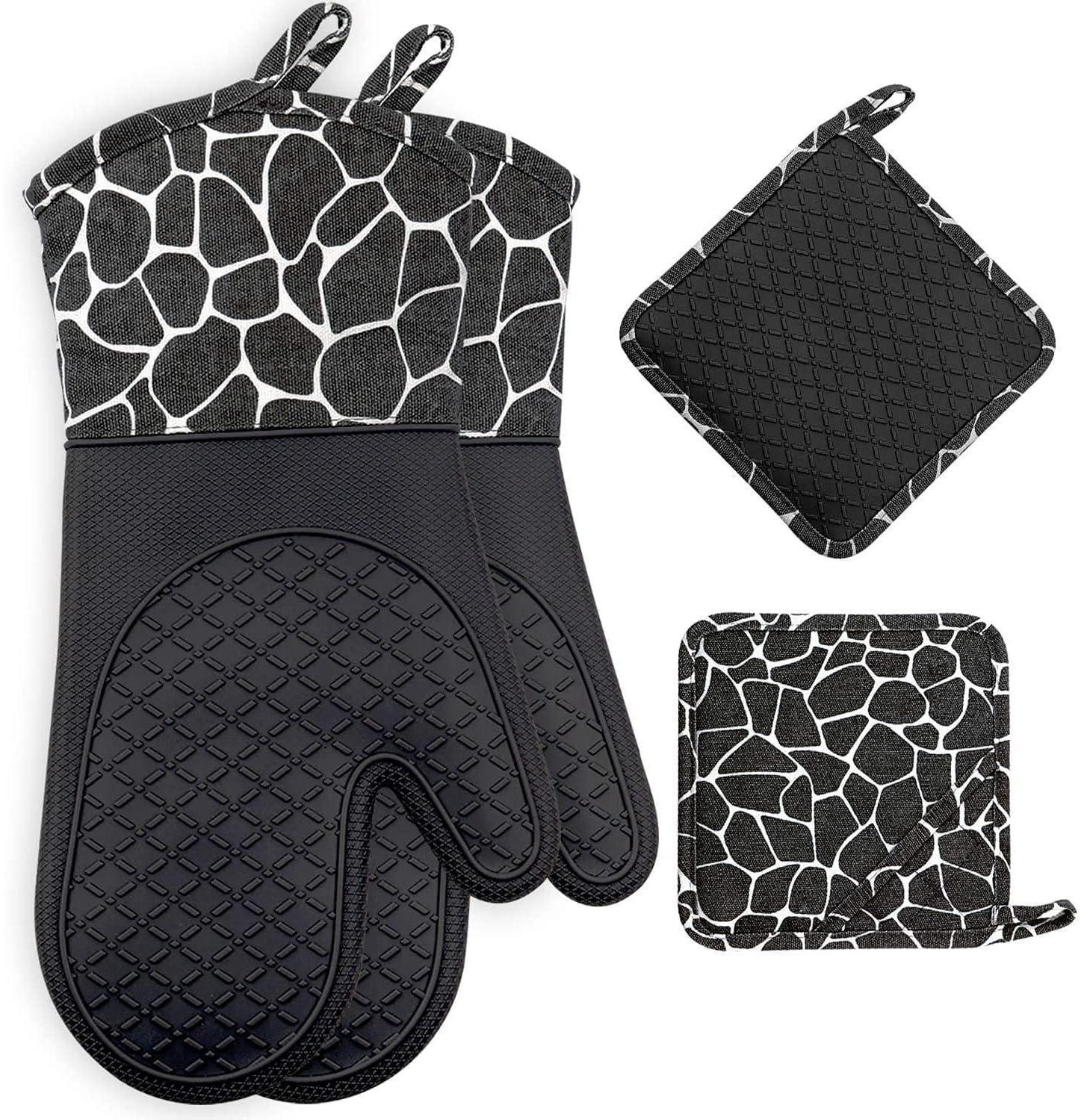 Topfhandschuhe Set Silikon/Baumwolle hitzebeständig 1 Paar+2 Topflappen Schwarz