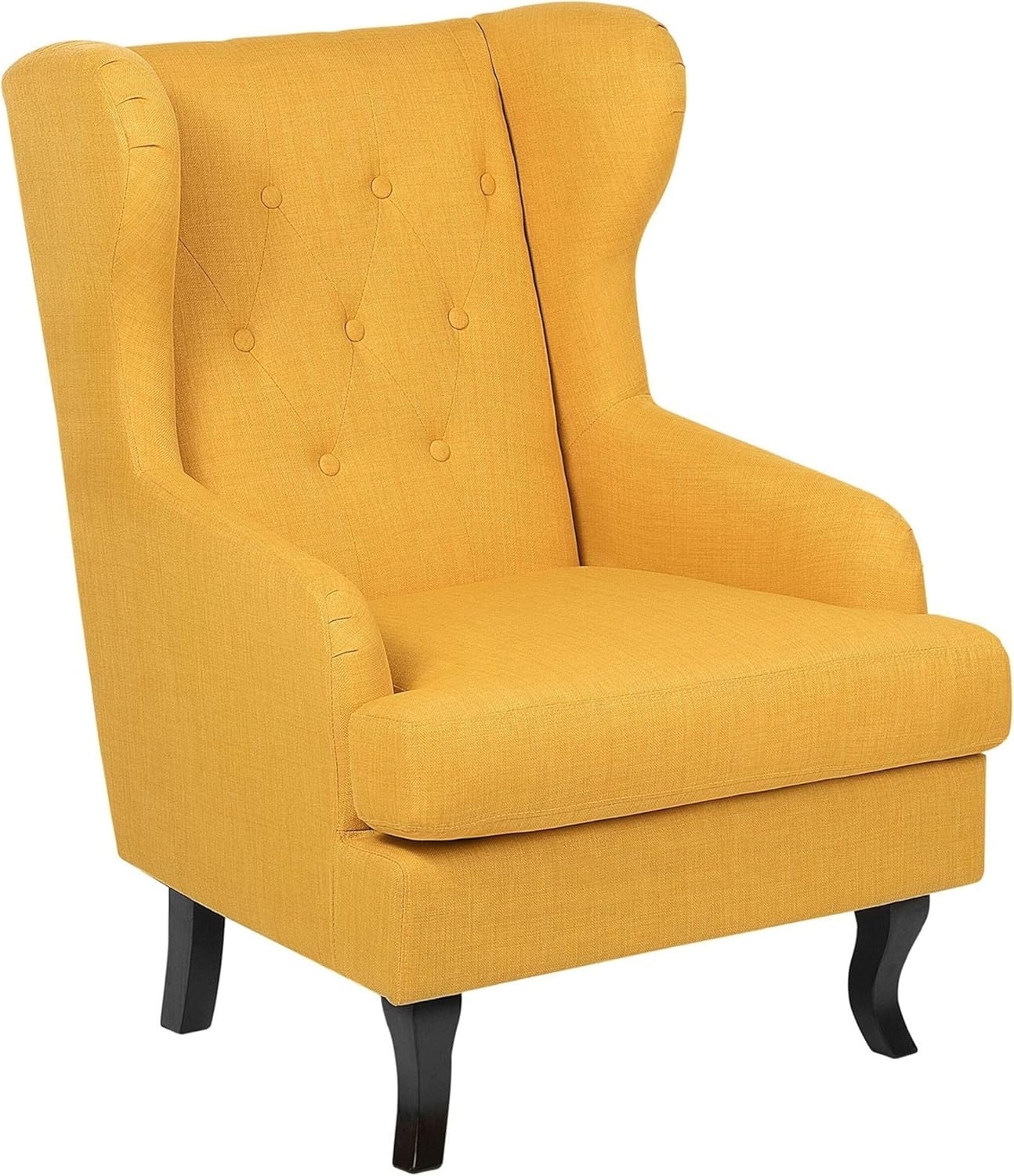 Klassischer Sessel im Chesterfield-Stil mit opulentem Erscheinungsbild. Der gelbe Polstersessel bietet durch seine bequeme Sitzhöhe von 43 cm und die leicht geneigte Rückenlehne hohen Komfort. Die geschwungenen Holzbeine aus Gummibaumholz und die lange Rückenlehne verleihen dem Sessel eine majestätische Note. Die gezielt platzierten Knopf-Verzierungen runden das edle Design ab. **Highlights** - Edler Chesterfield-Look für stilvolle Wohnräume - Dicke Polsterung für höchsten Komfort - Retro Stil, der zeitlose Eleganz ausstrahlt - Schutzkappen zum Schutz des Bodens - Hochwertiges Material für Langlebigkeit **Produkteigenschaften** - Typ: Sessel - Farbe: Gelb - Material: Polyester - Zusätzliches Material: Gummibaumholz - Füllmaterial: Schaumstoff - Gestellmaterial: Holz - Armlehnen: Ja, abgesenkt - Sitzkonstruktion: Elastische Gurtbänder - Schaumstoffdichte: 30 kg/m³ - Abmessungen (HxBxT): 102 x 72 x 78 cm - Sitzfläche: 72x54 cm - Höhe Armlehnen: 66 cm - Dicke der Polsterauflagen: 10 cm - Gewicht: 22 kg - Max. Belastung: 150 kg **Lieferumfang** - 1 x Sessel - Beine / Füße nicht montiert