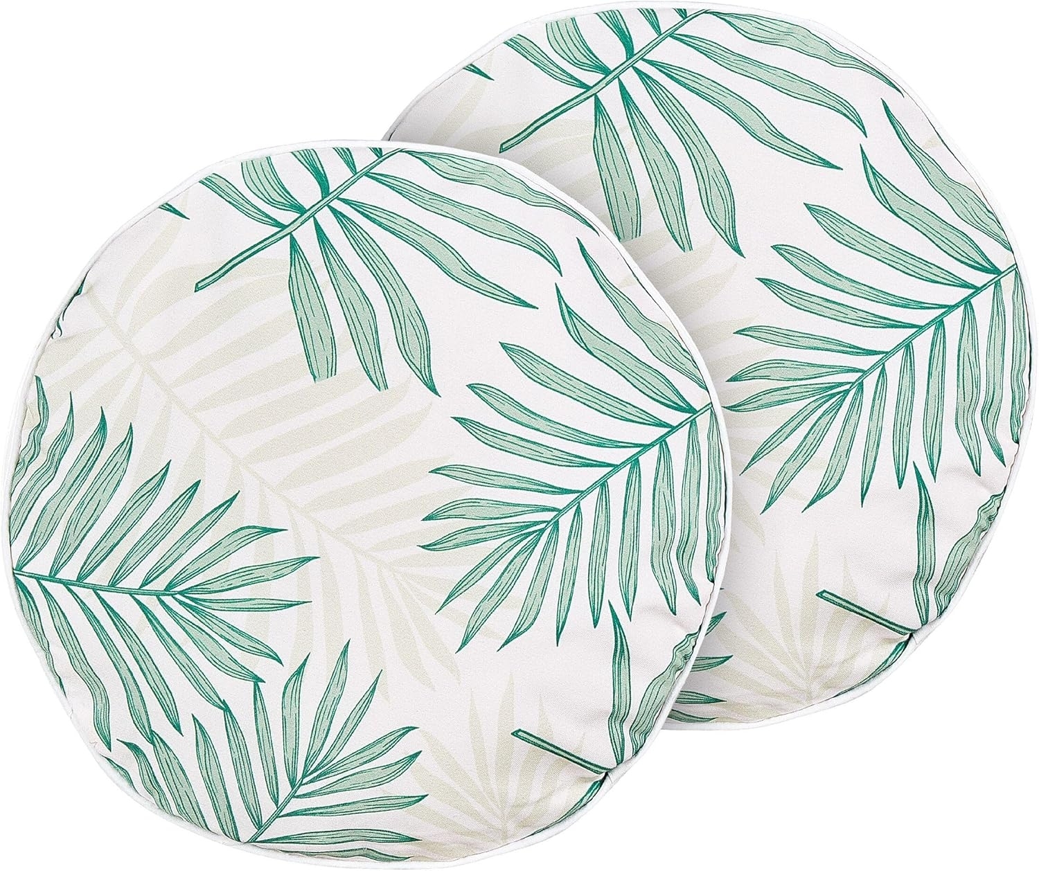 Gartenkissen 2er Set POGGIO mit einem Durchmesser von 40 cm in Grün bringt einen Hauch von Exotik in Ihren Außenbereich. Die Kissen sind aus 100 % Polyester gefertigt und zeichnen sich durch ihre Wasser- und UV-Beständigkeit aus. Das moderne Palmenblatt-Motiv sorgt für eine sommerliche Atmosphäre, während die gemütliche Ausstrahlung sowohl im Garten als auch im Innenbereich überzeugt. Pflegeleicht und strapazierfähig, sind diese Kissen die ideale Wahl für jeden Raum. **Highlights** - Modernes Design: Verleiht Ihrem Garten eine stilvolle Note. - Gemütliche Ausstrahlung: Schafft eine einladende Atmosphäre. - Dekorativ und funktional: Ideal für Innen- und Außenbereich. - Pflegeleichtes Material: Einfach zu reinigen und langlebig. - UV-Beständigkeit Klasse 5 (ISO 105-B02): Hohe Farbbeständigkeit. **Produkteigenschaften** - Typ: Gartenkissen - Stil: Modern - Farbe: Beige - Material: Polyester - Füllmaterial: Polyester - Zusammenstellung: 100 % Polyester - Form: Rund - Muster: Pflanzenmuster - Maße (HxBxT): 10 x 40 x 40 cm - Füllgewicht: 0,28 kg - Gewicht: 0,4 kg - Wasserbeständig: Ja - UV-beständig: Ja **Lieferumfang** - 2 x Gartenkissen - Keine Montage erforderlich - Vakuumverpackt