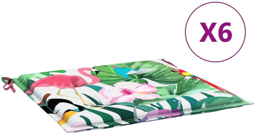 Verleihen Sie Ihrem Außenbereich mit den vidaXL Gartenstuhl-Kissen im praktischen 6er-Set eine frische Note. Diese Kissen bestehen aus langlebigem, wasserabweisendem Oxford-Gewebe und bieten dank der weichen Polsterung mit Schaumstofffasern optimalen Sitzkomfort. Sie sind vielseitig einsetzbar und verfügen über ein rutschfestes Design, das eine sichere Befestigung an Möbeln ermöglicht. **Highlights** - Langlebiges Oxford-Gewebe - Weiche Polsterung mit Schaumstofffasern - Vielseitig einsetzbar im Innen- und Außenbereich - Rutschfestes Design mit praktischen Schnüren - Schöne Muster mit Vögeln, Blättern und Blumen **Produkteigenschaften** - Material: 100 % Polyester (Oxford-Gewebe) - Füllmaterial: Schaumstofffaser - Abmessungen: je 40 x 40 x 4 cm (L x B x T) - Schnurlänge (pro Stück): 30 cm - Wasserabweisend **Lieferumfang** - 6 x vidaXL Gartenstuhl-Kissen