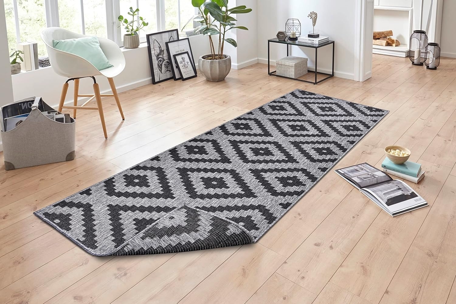 In- & Outdoor Teppich Malta Schwarz Silber - 80 x 350 x 0,5 cm. Dieser zweiseitig verwendbare Flachgewebeteppich bringt Abwechslung in Ihre Räume. Durch einfaches Umdrehen erhalten Sie eine neue Ansicht. Die Sisal-Optik vermittelt den Eindruck von Naturfasern, besteht jedoch aus 100 % Polypropylen. Der Teppich ist hochwertig verarbeitet und eignet sich sowohl für den Innenbereich als auch für Garten, Terrasse und Balkon. **Highlights** Flachgewebe Wendeteppich für In- und Outdoor aus 100 % Polypropylen Hergestellt in Europa, Florhöhe: ca. 5 mm, Gewicht: ca. 1,35 kg/m² Besonders langlebig und strapazierfähig Für Innenräume mit Fußbodenheizung nutzbar sowie im Außenbereich unter Feuchtigkeit und UV-Strahlung Umgekehrte Farbdarstellung auf der Rückseite und farblich abgestimmte Kettelung ringsum **Produkteigenschaften** Maße (LxBxH): 80 x 350 x 0,5 cm Wasserfester Teppich, leicht zu reinigen Geeignet für alle Unterböden, einschließlich Parkett und Laminat Regelmäßiges Absaugen und Ausklopfen empfohlen Qualität und kurze Transportwege, alle Produkte in Europa hergestellt