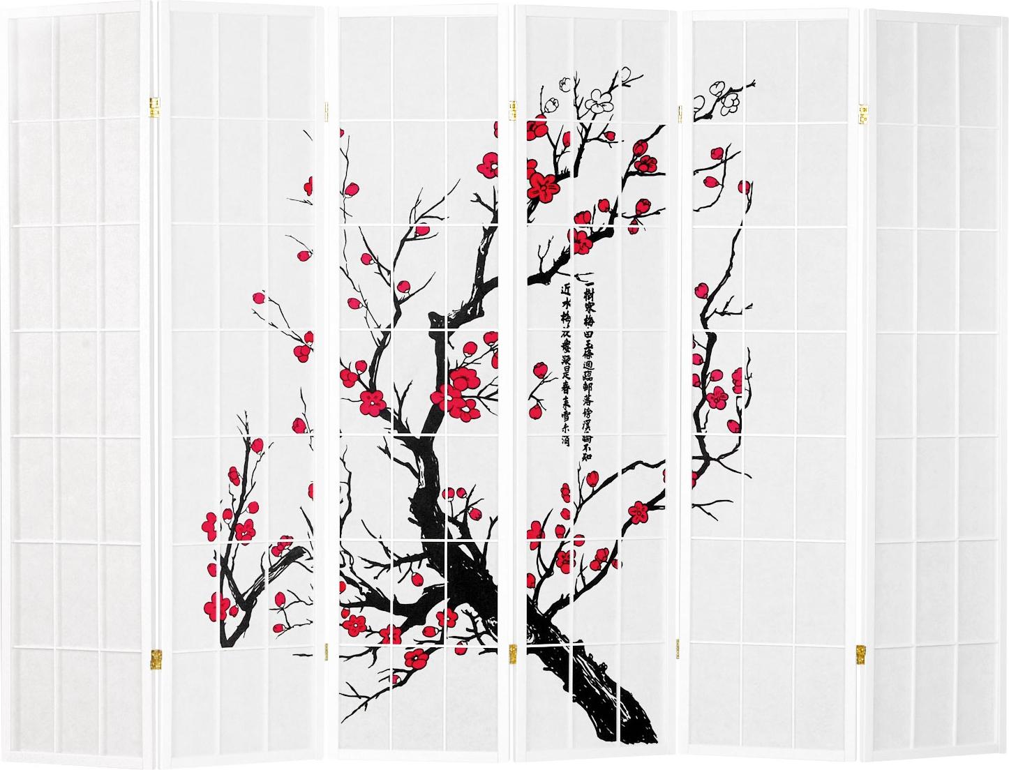 Paravent Raumteiler 6 teilig Holz Reispapier Weiß, Kirschmuster, Höhe 179 cm