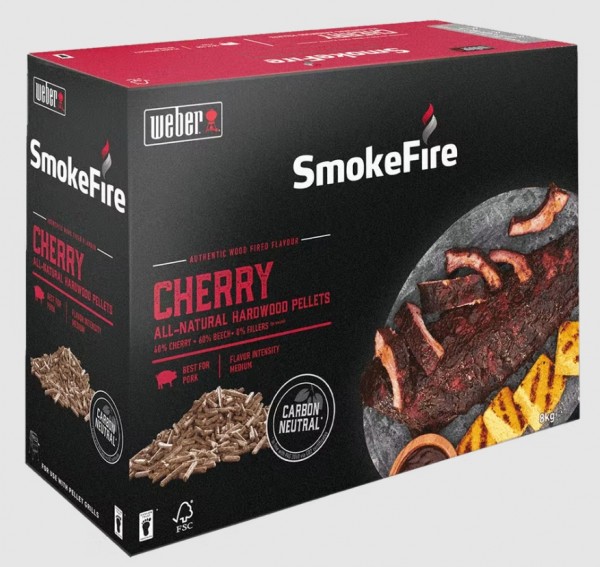 - Die Weber SmokeFire Holzpellets aus Kirschholz sorgen für einen authentischen Holzfeuer-Geschmack beim BBQ.