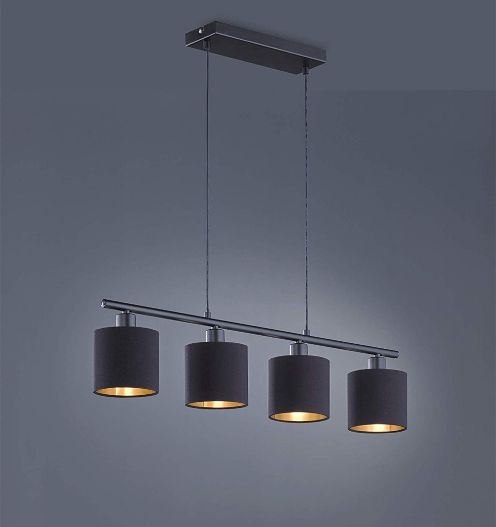 **Die Pendelleuchte TOMMY steht für ein wohnliches Licht, da Textilschirme den Behaglichkeitsfaktor erhöhen und ein gemütliches Ambiente zaubern. Zeitgleich zaubern die klaren Formen einen modernen und schlichten Stil, der sich vielseitig einsetzen und kombinieren lässt. Das vierflammige Pendel hat eine Größe von 75×12 cm und eignet sich optimal für eine Platzierung mittig über dem Esstisch. Bei der Montage kann die Abhängelänge bis zu einer Höhe von 150 cm festgelegt werden. Die Leuchte ist aus schwarz matten Metall hergestellt und wird durch vier Stoffschirme in der modernen Farbkombination schwarz und gold ergänzt. Die Kombination schafft stilvolle Lichtakzente und verleiht Wohn- und Essbereichen zusätzlich einen außergewöhnlichen Wohlfühleffekt. Für eine energiesparende Beleuchtung empfiehlt sich die Verwendung eines LED Leuchtmittels. Diese sind eine optimale Alternative zu herkömmlichen Halogen Leuchtmitteln und stehen für eine hohe Lichtqualität und eine Energieeinsparung von bis zu 80%. Zusätzlich profitieren Sie bei LED Leuchtmitteln von einer langen Lebensdauer, einer geringen Wärmeentwicklung und schonen gleichzeitig die Umwelt.** **Ausführung** Material: Metall/Stoff Farbe: schwarz matt/Stoff schwarz/gold Leuchtmittel: 4x E14 **Maße** Länge: 75cm Breite: 12cm Höhe: 150cm **Lieferumfang** 1 Pendelleuchte ohne Leuchtmittel **Hinweis** Für den Betrieb sind 4 Leuchtmittel für Fassung E14 erforderlich. Diese Leuchtmittel sind im Lieferumfang nicht enthalten.