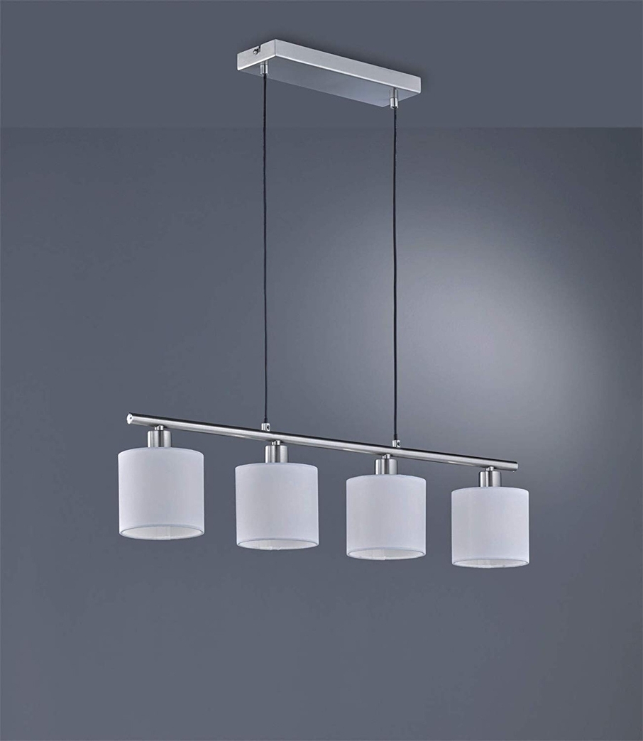 Auf der Suche nach dekorativen Hängelampen fällt diese schöne Pendelleuchte aus dem Hause Reality Leuchten sofort ins Auge. Mit ihrem ansprechenden Design wird sie schnell zum neuen Blickfang in Ihrem Wohnraum. Das Kennzeichnende der 4 flammigen Pendelleuchte sind die weißen Lampenschirme aus Stoff. Mit einem Durchmesser von jeweils 12cm sorgen sie für ein angenehmes Licht und verleihen der insgesamt 75 cm breiten Hängelampe ihren unverwechselbaren Charakter. Der Korpus ist aus mattem Silber gefertigt. Er komplettiert das elegante Erscheinungsbild der Hängeleuchte. Mit diesen Eigenschaften ausgerüstet, eignet sich das Pendel somit perfekt als Esstischlampe oder Küchenlampe. Wenn Sie also auf der Suche nach Esszimmerlampen, Küchenlampen oder sonstigen attraktiven Wohnraumleuchten sind, wird die Pendelleuchte TIMMY Ihren Wünschen mit Sicherheit in jeder Hinsicht gerecht. Die Hängelampe ist mit vier E14 Fassungen ausgestattet und für Leuchtmittel bis maximal je 28 Watt geeignet. Diese sind nicht mit im Lieferumfang enthalten und müssen separat bestellt werden. Bei Verwendung von dimmbaren Leuchtmitteln können Sie das Pendel über Ihre Hausinstallation dimmen und so für eine ganz individuelle Beleuchtung sorgen. \* Geeignet für 4 x E14-Leuchtmittel bis max. 28W (nicht enthalten)