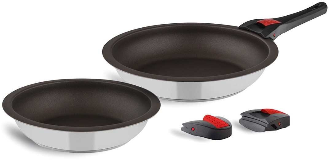 Das 5-teilige Kuppels QUICK CLACK PRO Pfannenset in Schwarz ist ideal für Wohnmobile oder kleine Küchen. Mit abnehmbaren Griffen lassen sich die Pfannen einfach an- und abklicken. Sie können auch als Auflaufform verwendet werden. Die Whitford Eterna Beschichtung sorgt dafür, dass nichts anbrennt, auch ohne Öl. Das Set ist für alle Herdarten, einschließlich Induktion, geeignet und besteht aus 2 Pfannen (Ø 20 cm / Ø 24 cm), 1 Stielgriff und 2 Kurzgriffen aus Kunststoff. **Highlights** - Platzsparendes Pfannen-Set - Abnehmbare Griffe für einfache Handhabung - Auch als Auflaufform verwendbar - Whitford Eterna Beschichtung für einfaches Braten ohne Anbrennen - Geeignet für alle Herdarten, inklusive Induktion **Produkteigenschaften** - Material: 18/10 Edelstahl mit Eterna Antihaftbeschichtung - Spülmaschinenfest - Backofenfest bis 240 °C - Thermo-Sandwichboden für gleichmäßige Wärmeverteilung - Energiesparendes Braten **Lieferumfang** - 2 Pfannen (Ø 20 cm / Ø 24 cm) - 1 Stielgriff - 2 Kurzgriffe aus Kunststoff